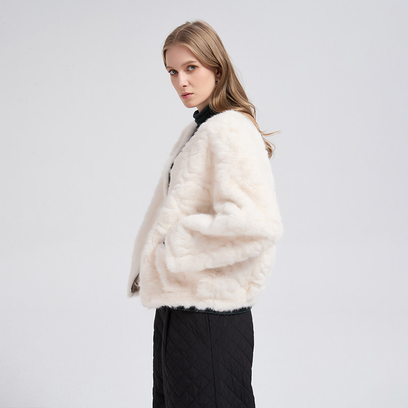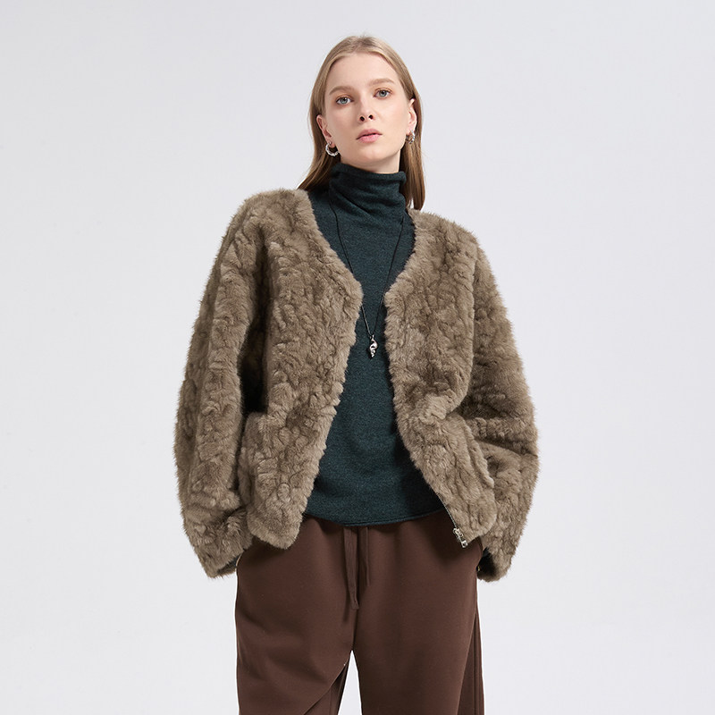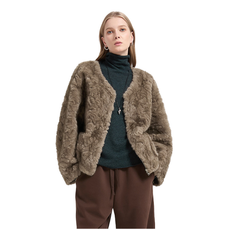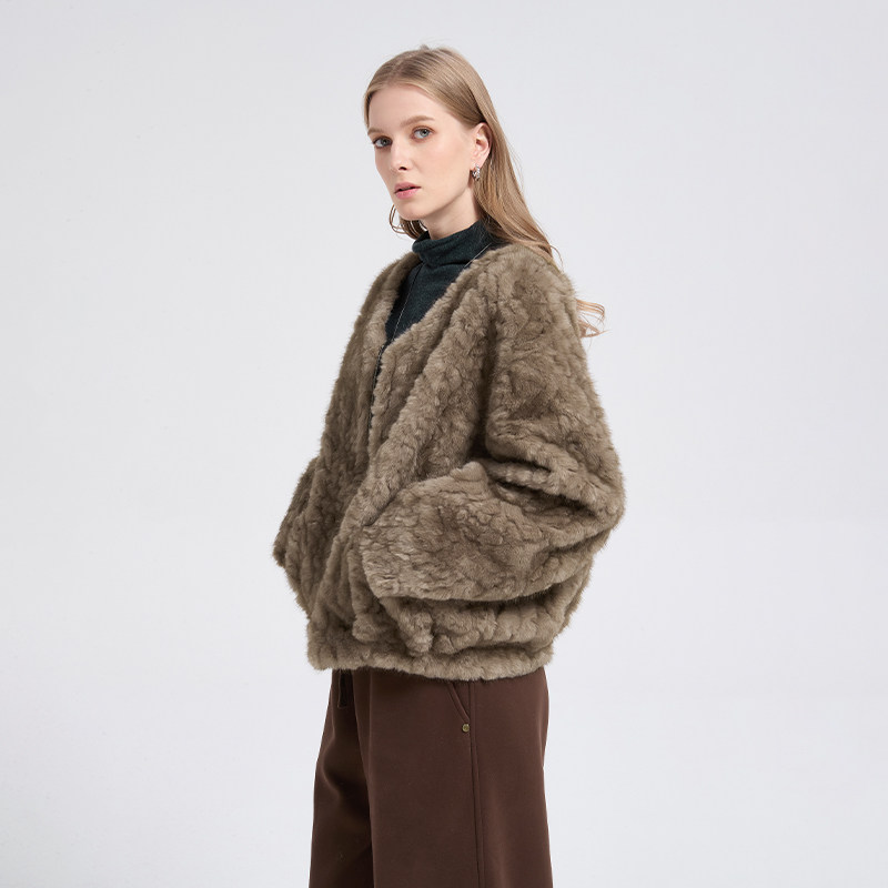Petit Bari慵懒V领卷毛环保皮草短款夹克外套女 秋冬保暖
