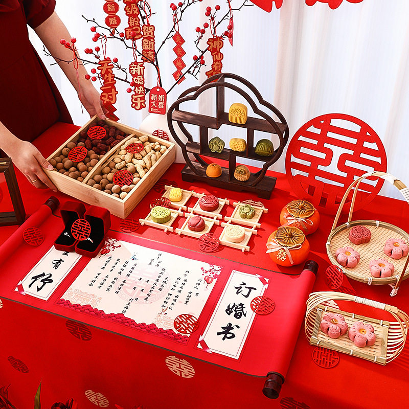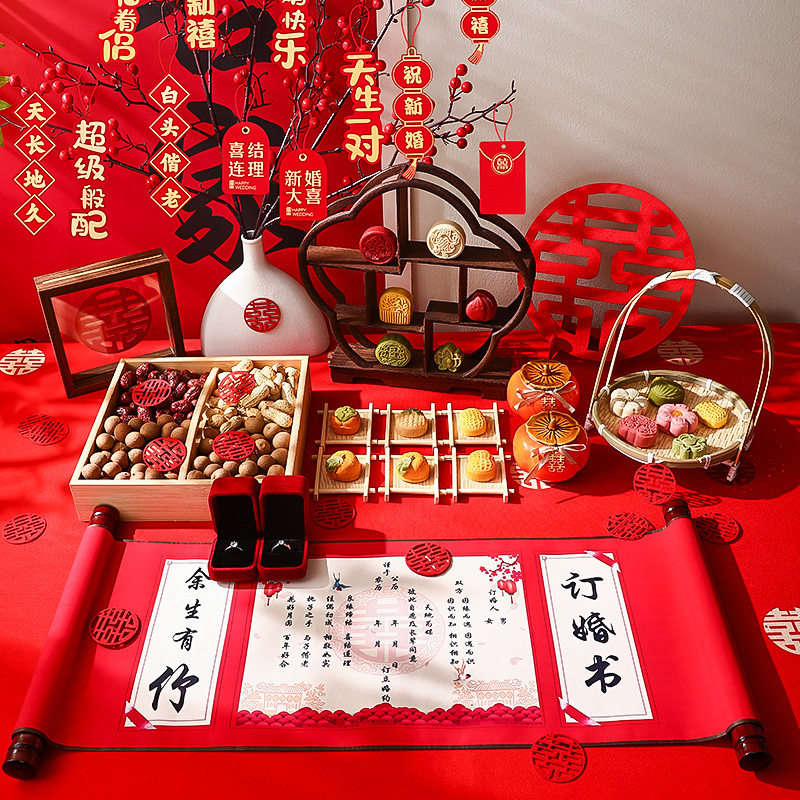 订婚宴摆台布置装饰结婚中式婚书甜品台果盘小摆件喜饼糕点心全套
