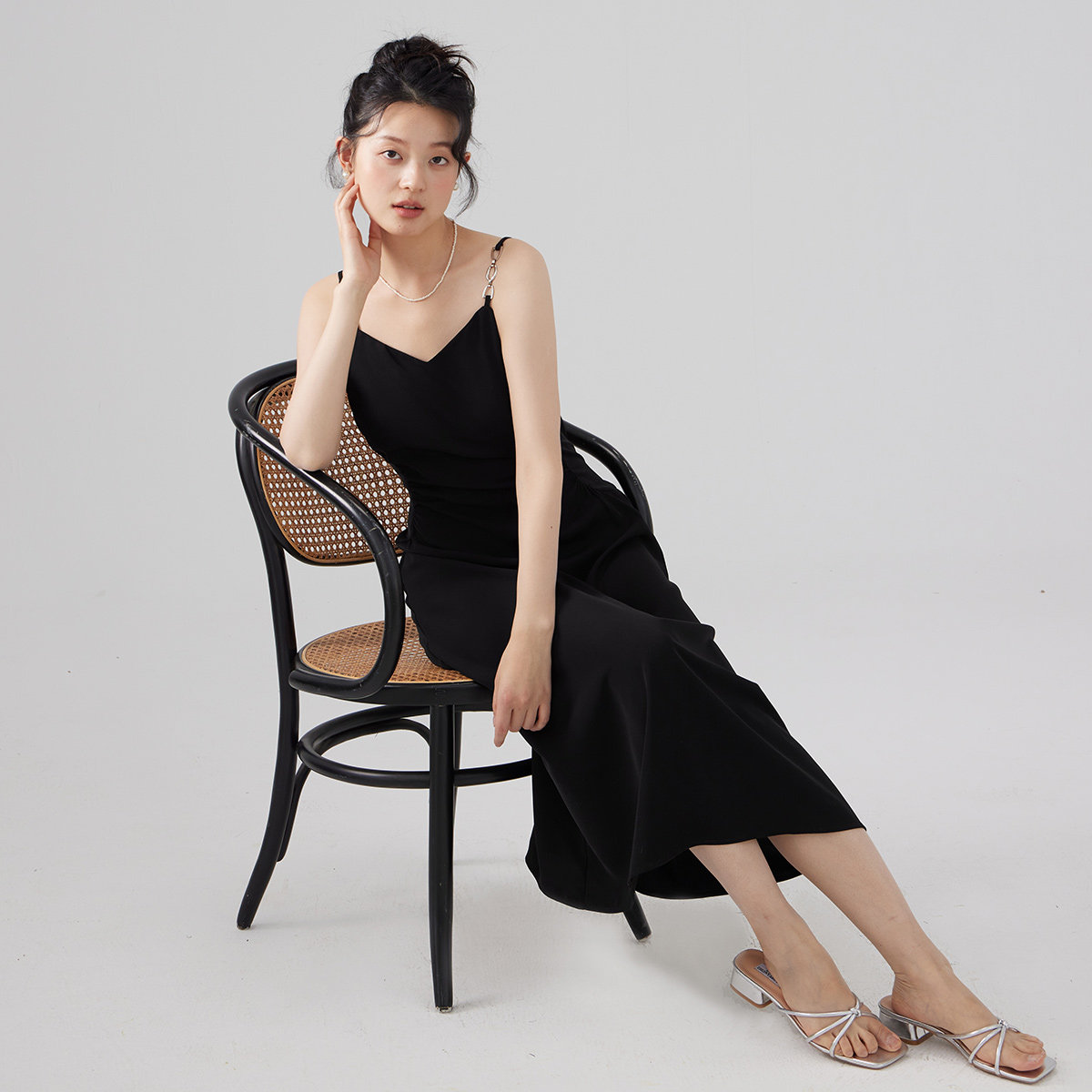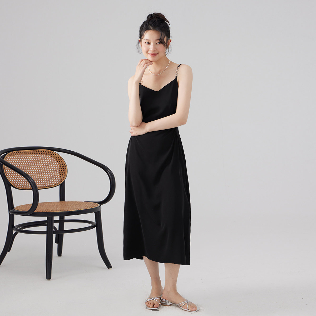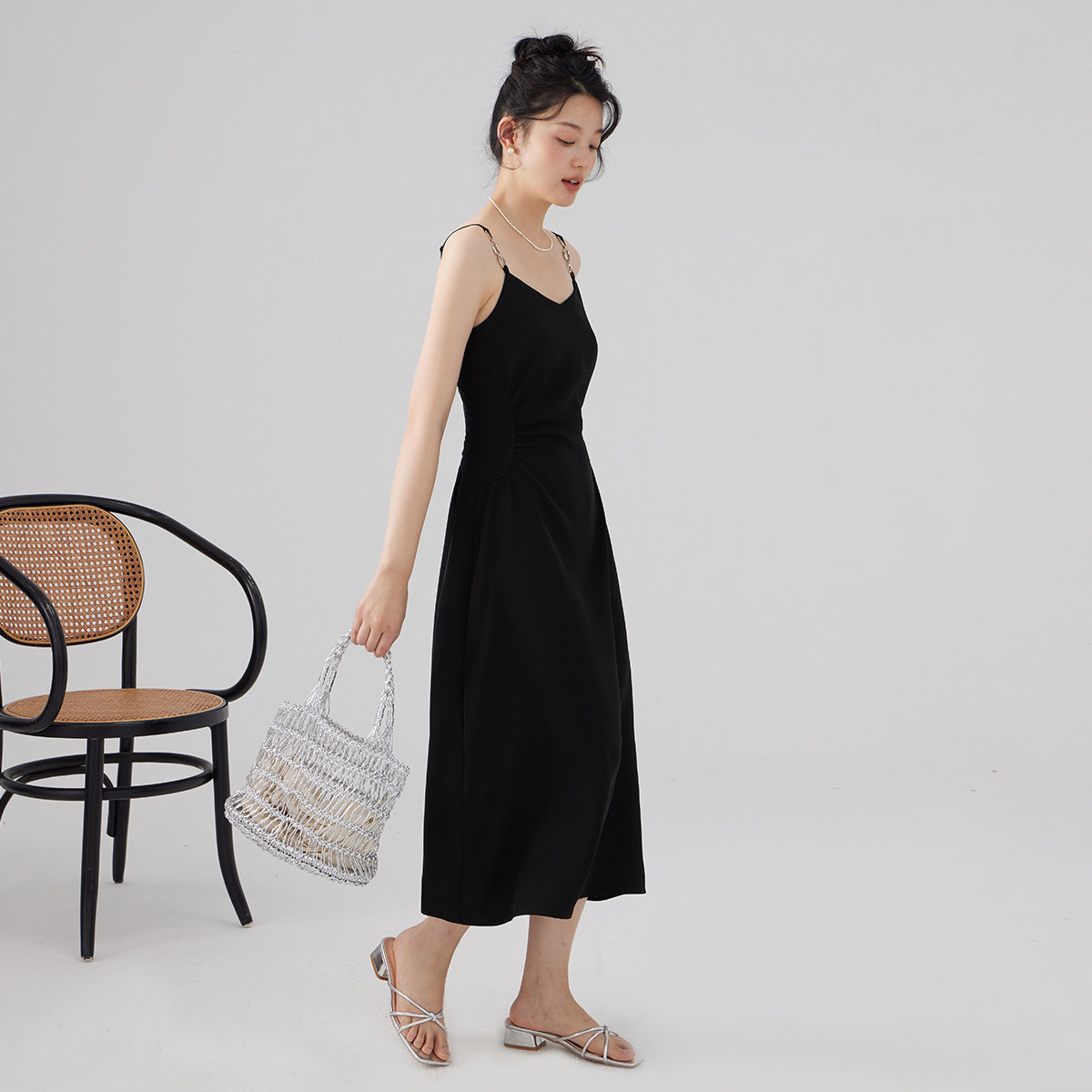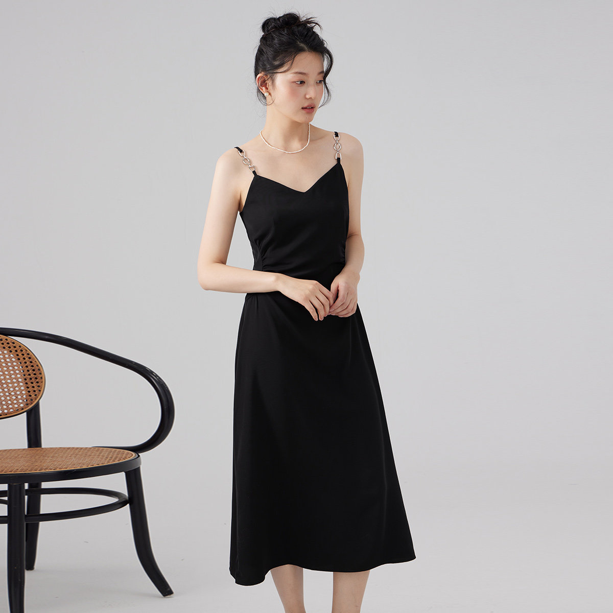 one more吊带连衣裙女2025新款v领修身打底小黑裙高级感显瘦裙子