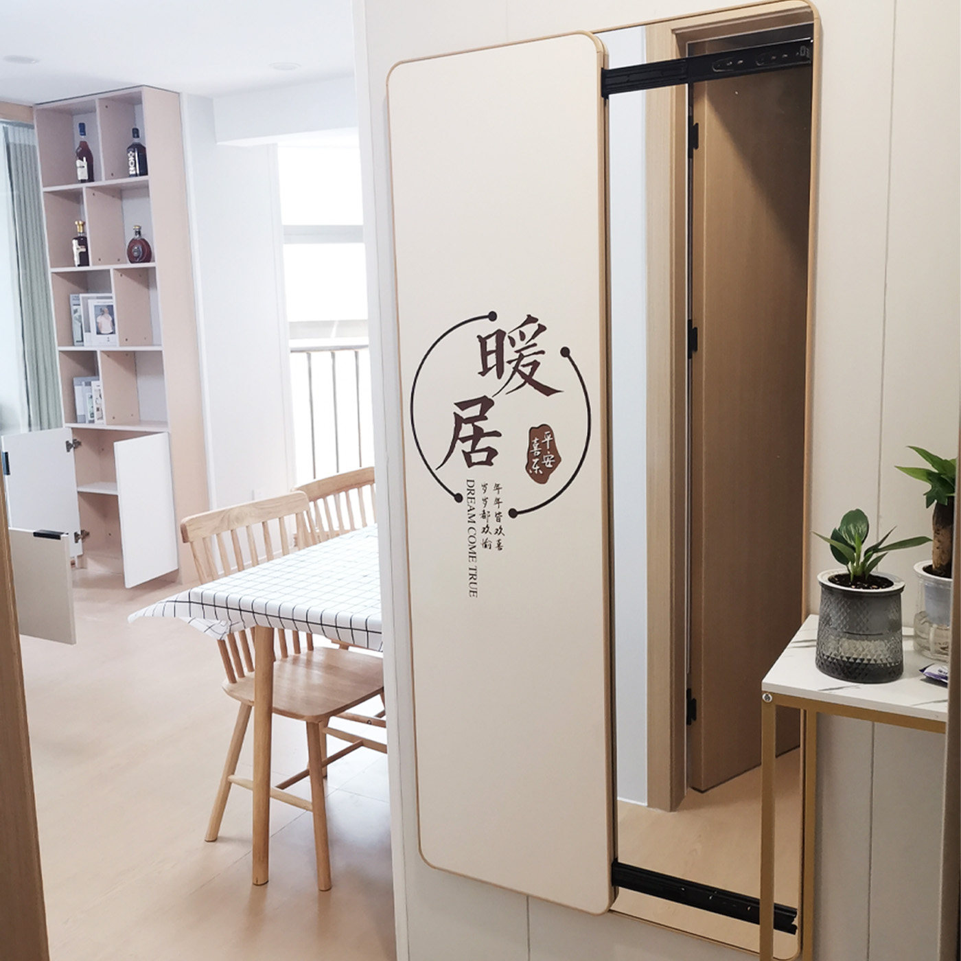 隐形推拉镜子奶油风装饰画壁挂全身镜百福图镜画卧室隐藏式穿衣镜