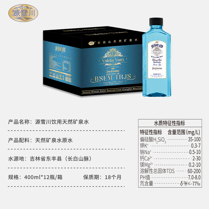 源雪川长白山天然矿泉水400ml*12瓶整箱低氘弱碱性饮用水100%源水