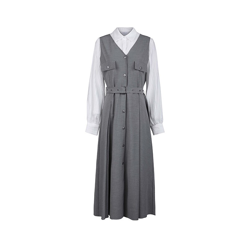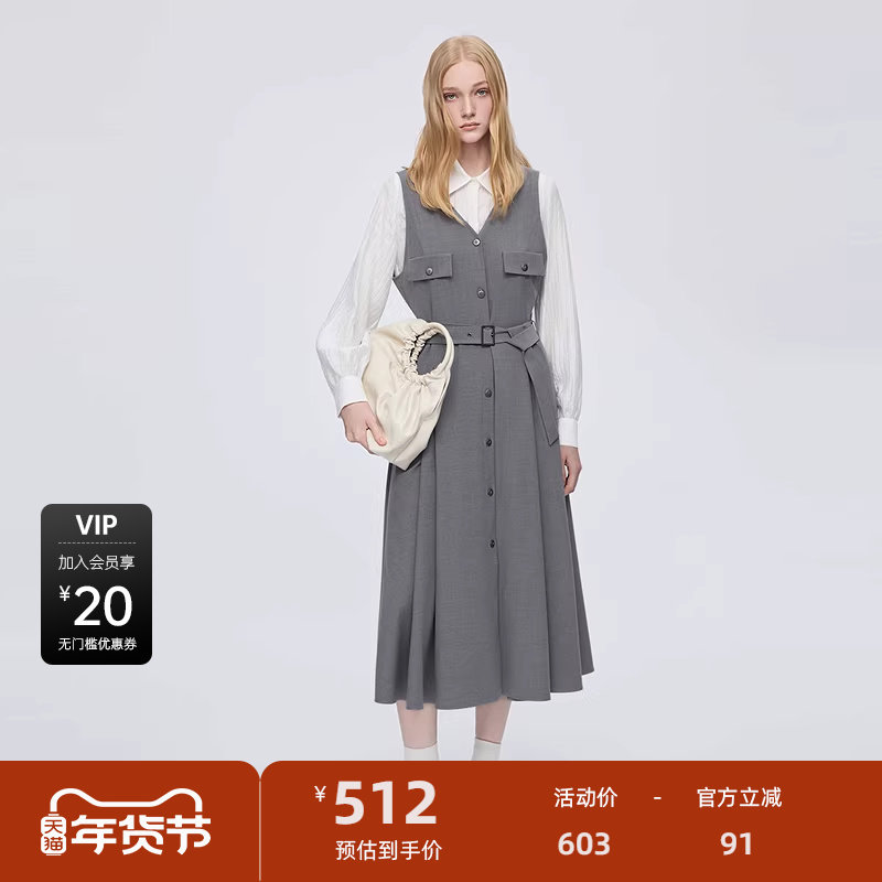 sdeer圣迪奥女装25年新品学院风翻领收腰撞色连衣裙套装S253Z1414