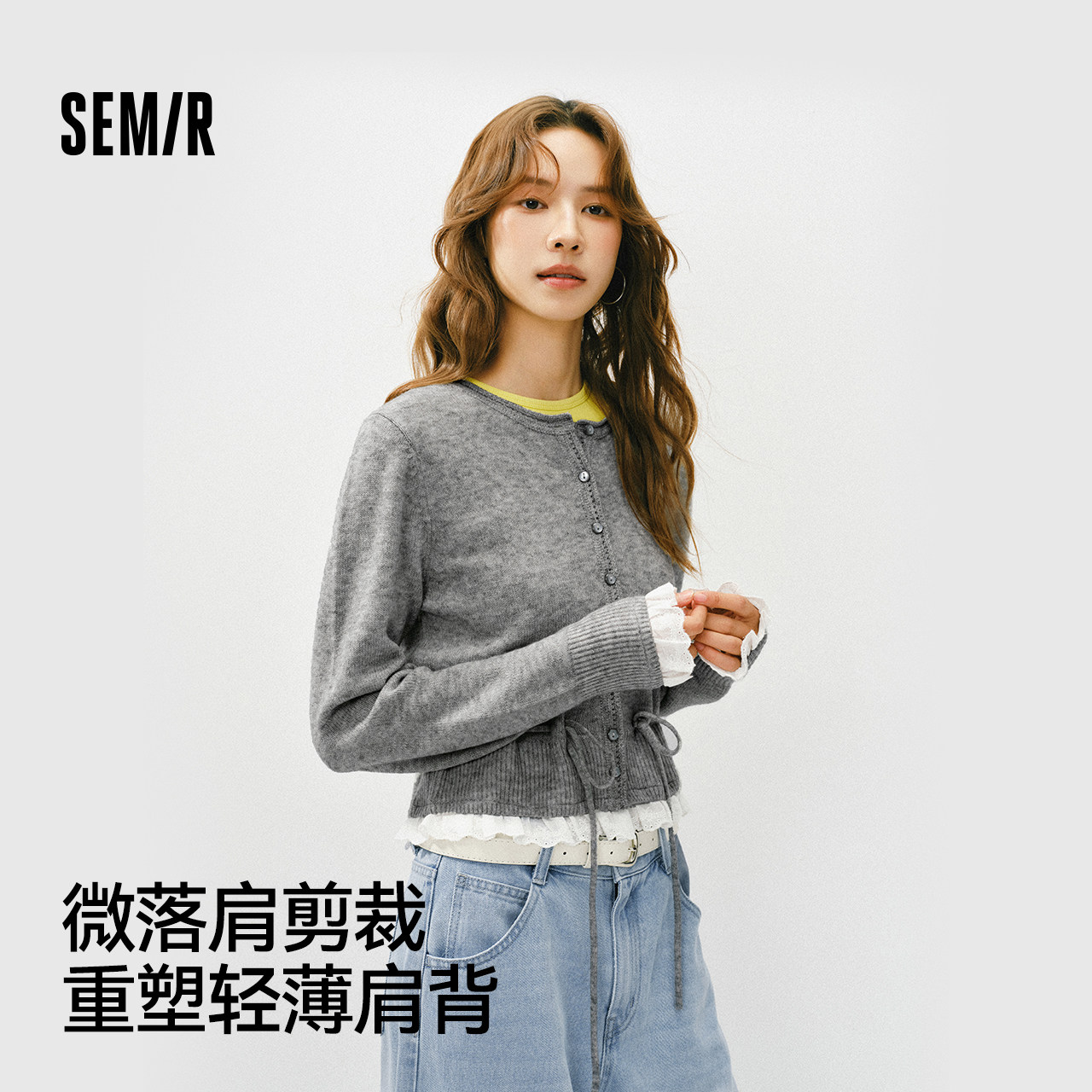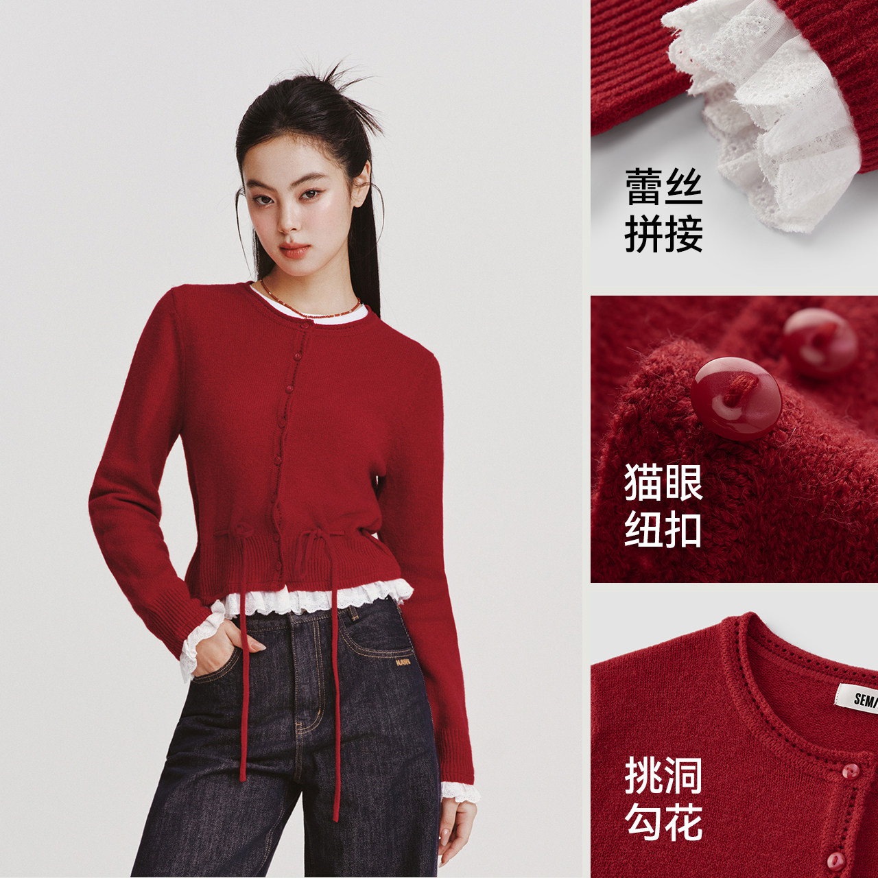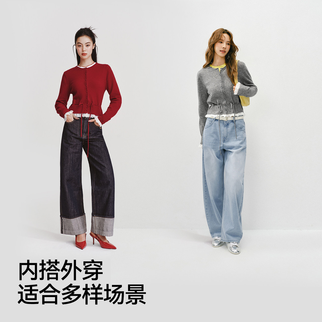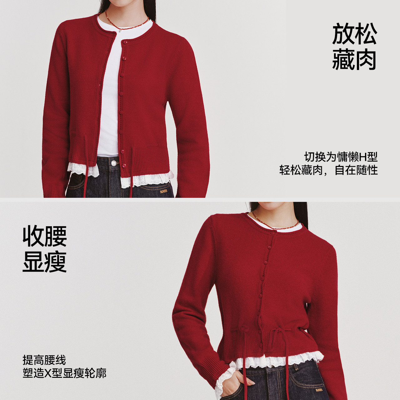 森马针织开衫女春季短款撞色蕾丝收腰2026新款俏皮少女感甜美上衣