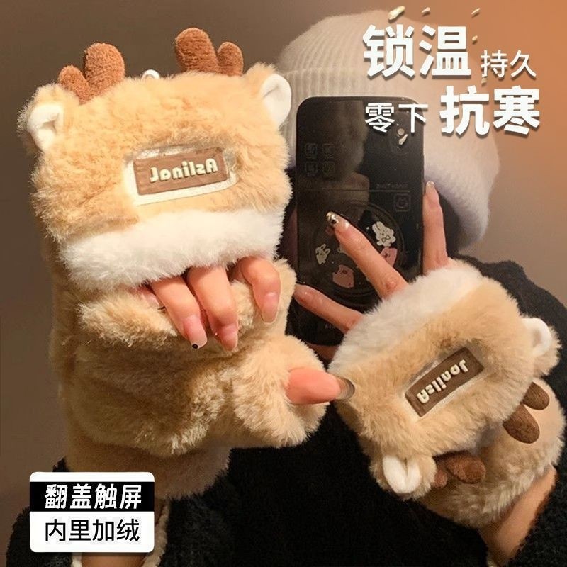 可爱圣诞毛绒手套冬季新款女款加厚保暖学生防寒半指翻盖加绒骑车