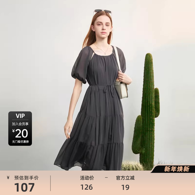 sdeer圣迪奥女装雪纺收腰镂空泡泡袖连衣裙S223Z121M