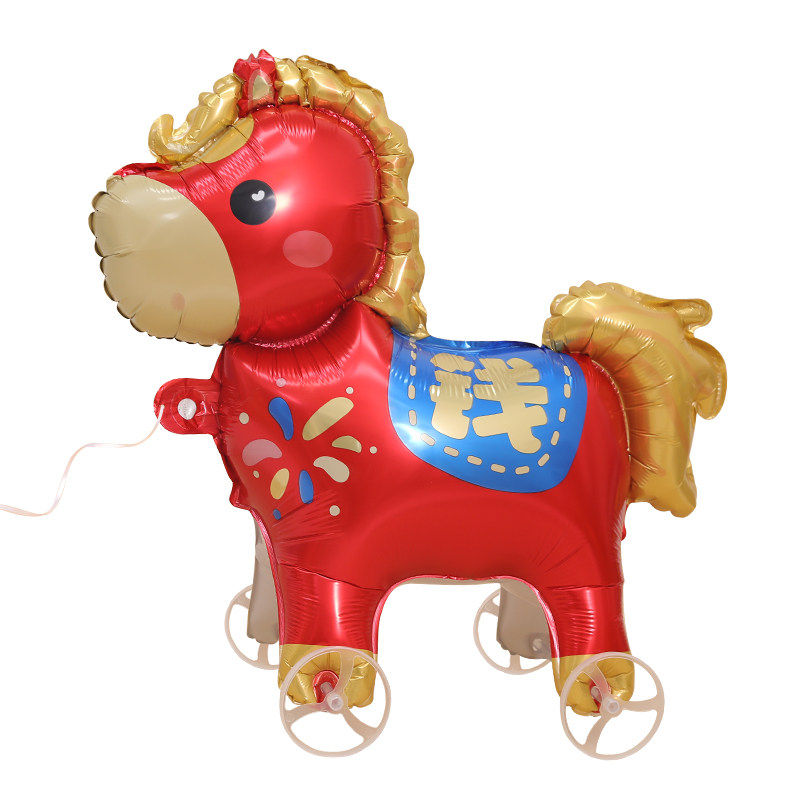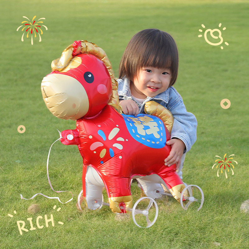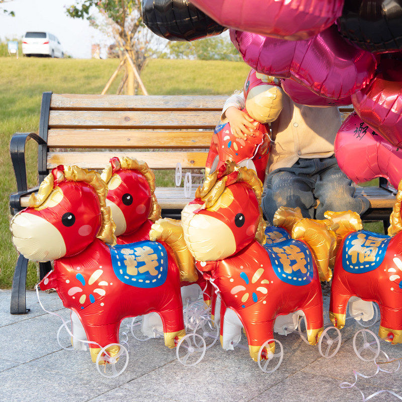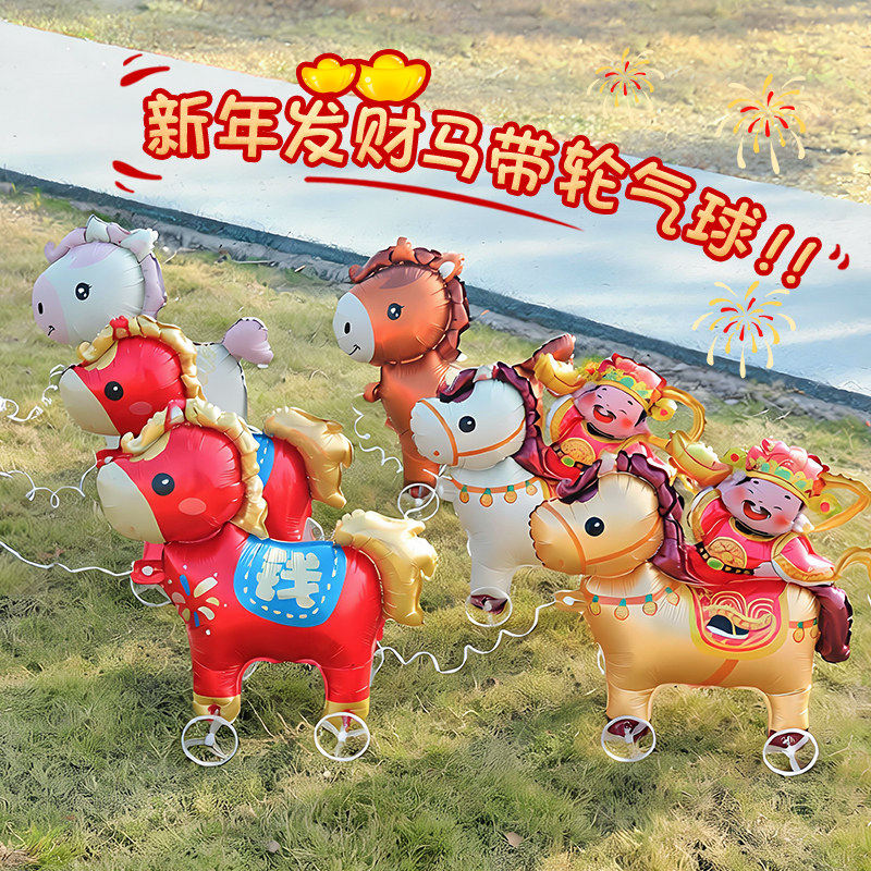 2026新年马上有钱走路气球可爱卡通带轮铝膜儿童装饰轮子造型马年