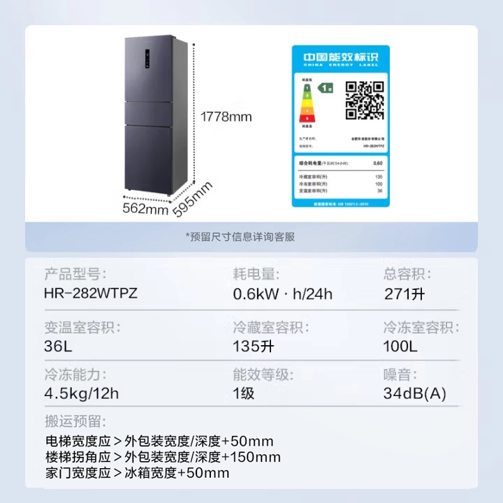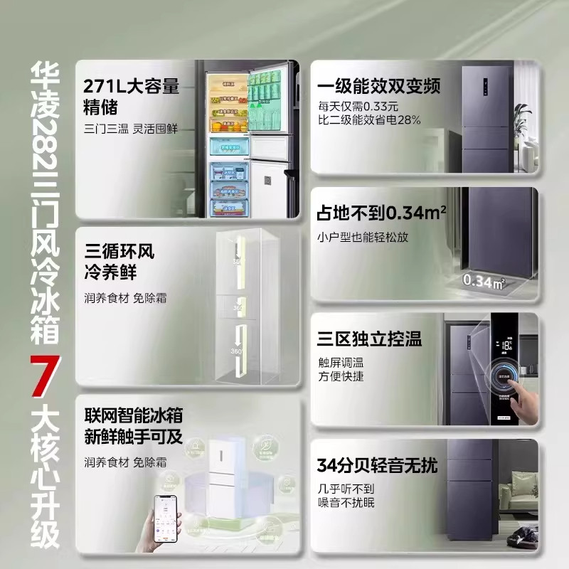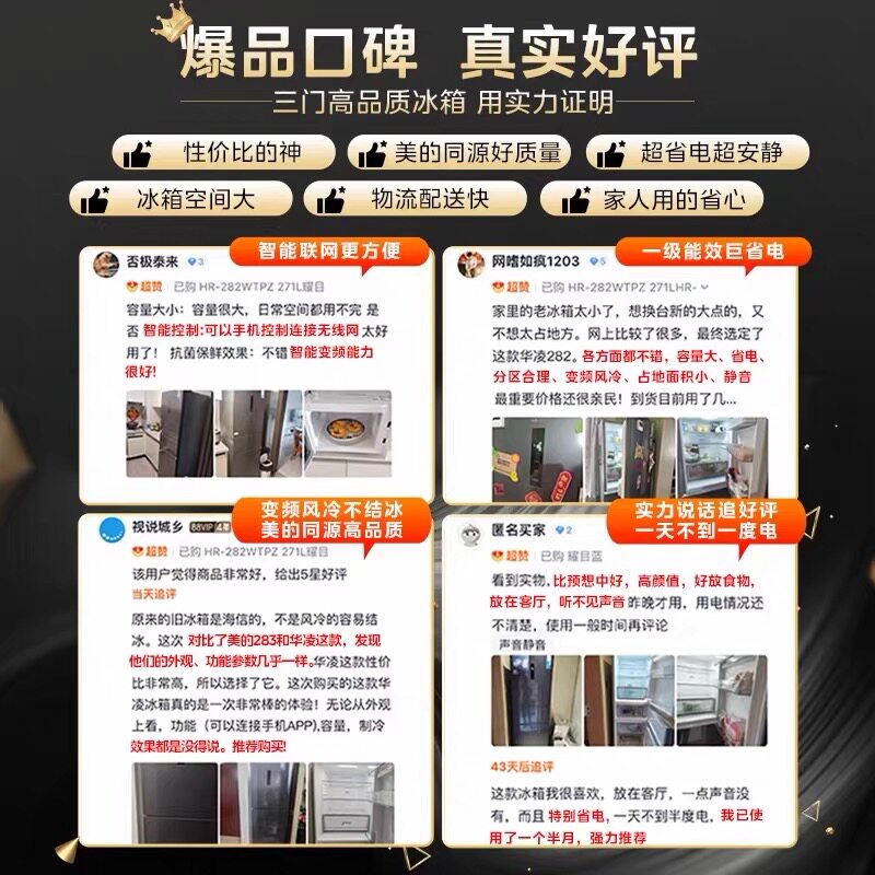美的出品华凌282三开门冰箱家用小型变频一级节能风冷无霜租房