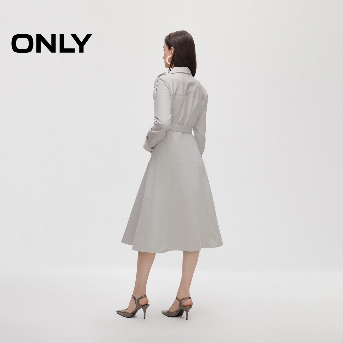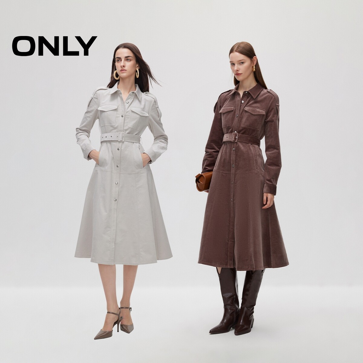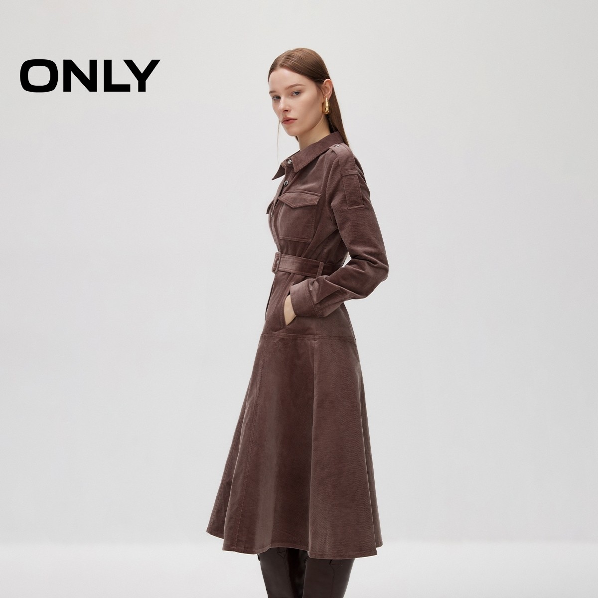 ONLY2026春季新款时尚复古裙子修身A字腰带收腰中长款长袖连衣裙