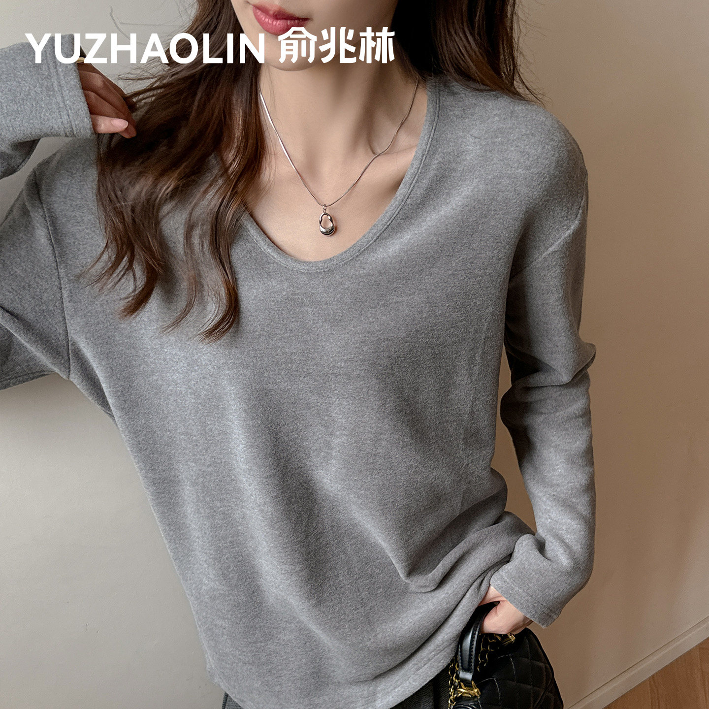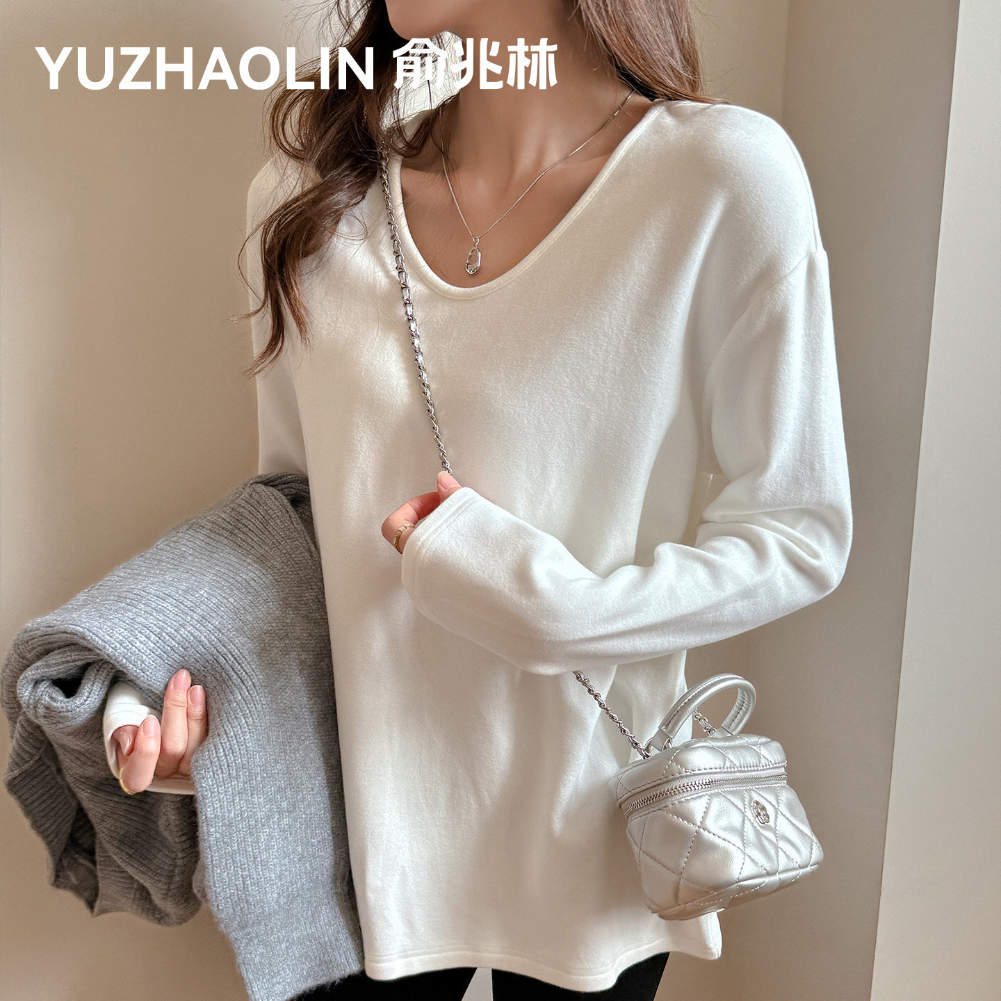 白色德绒V领打底衫女内搭2025新款秋冬季中长款加绒加厚长袖上衣