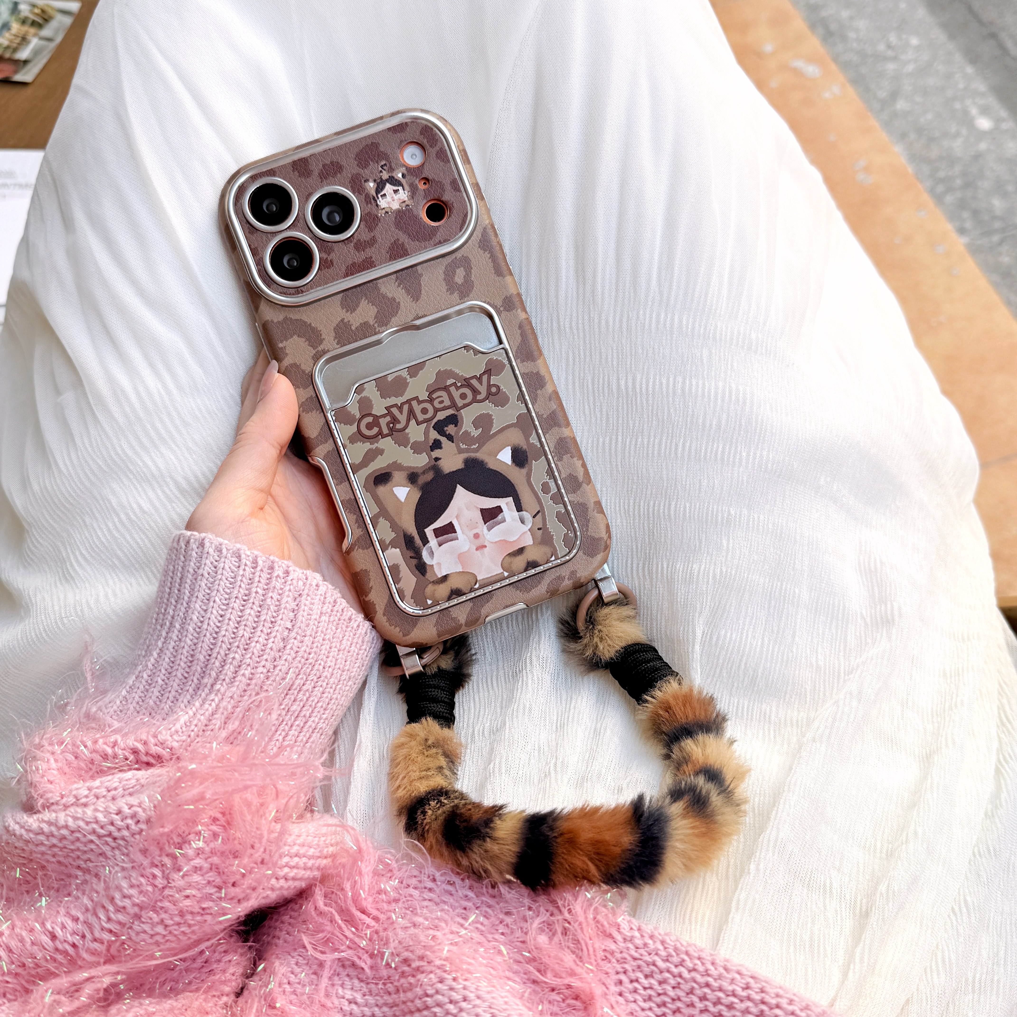日韩卡通哭娃公仔毛绒豹纹适用iPhone17ProMax手机壳苹果15pro软胶保护套手提挂绳可爱喵喵16PM软壳14/13网红