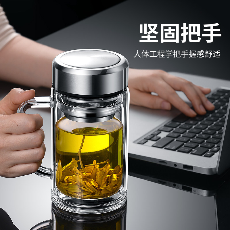 大容量玻璃杯双层防爆耐热男士带把手茶水分离茶杯办公高档水杯