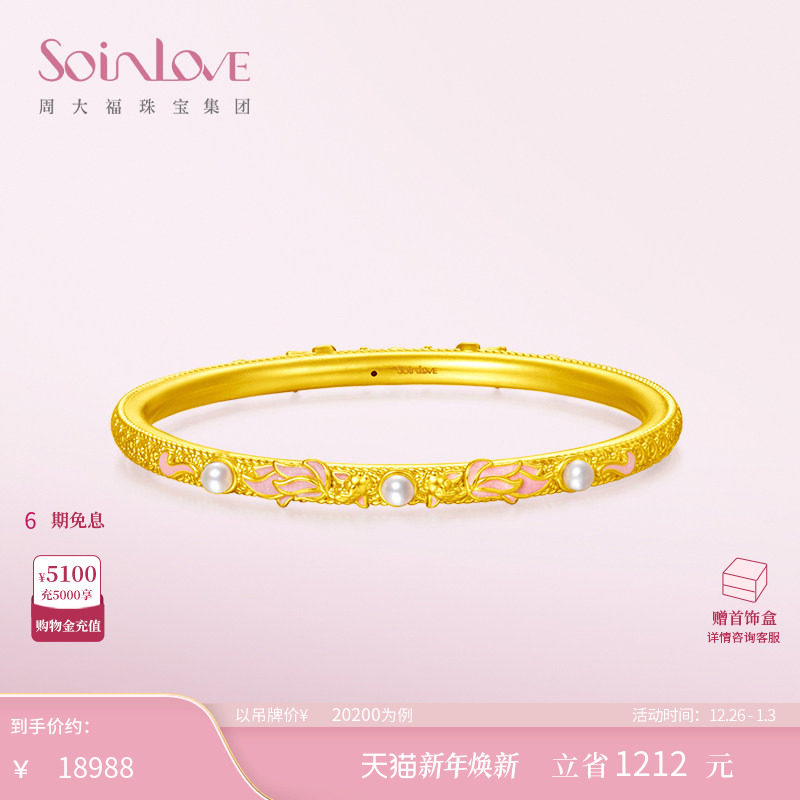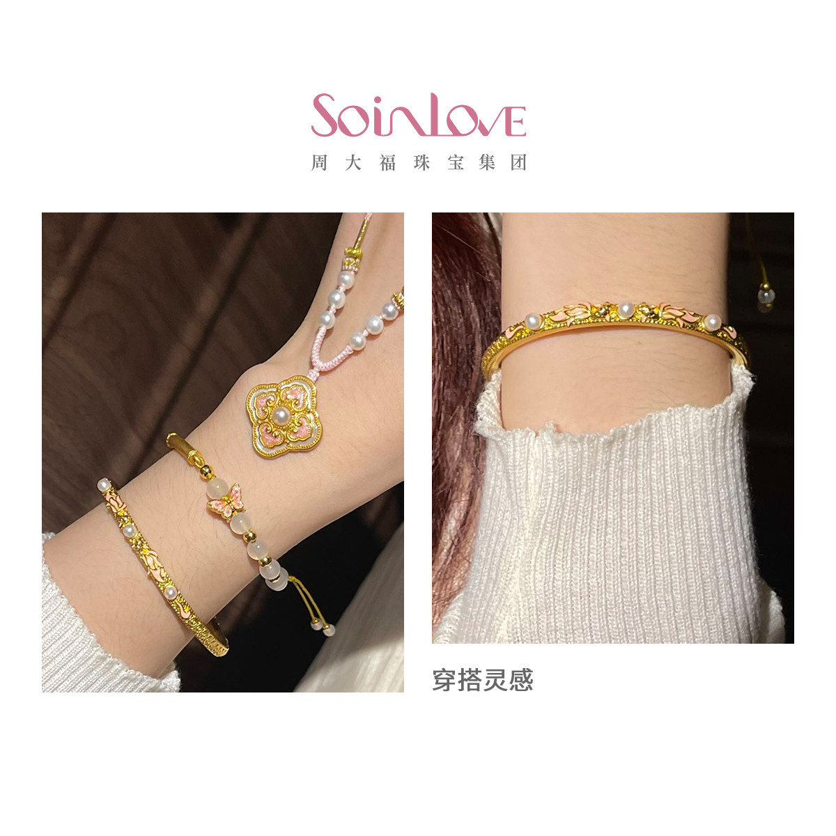 周大福SOINLOVE 蜜粉金十里红妆 锦鲤珍珠黄金手镯女生日礼物