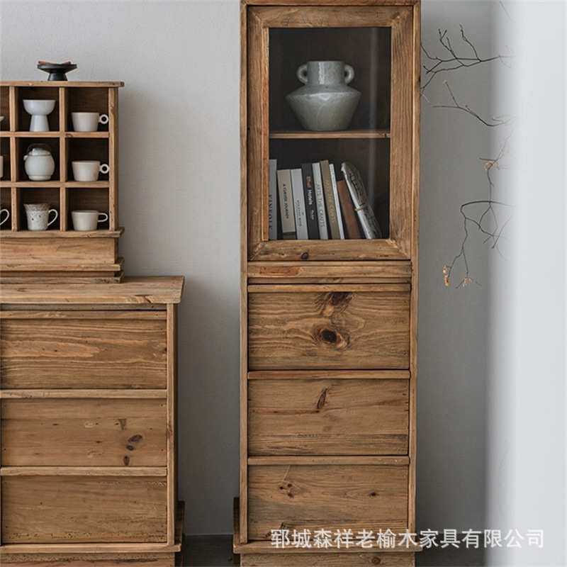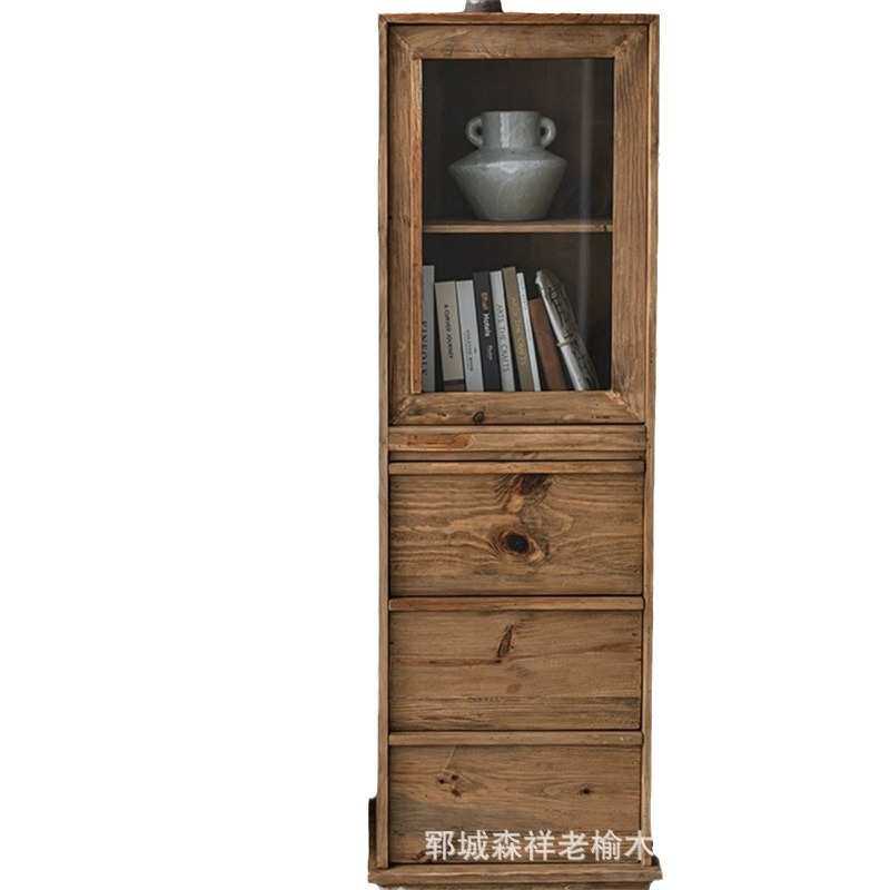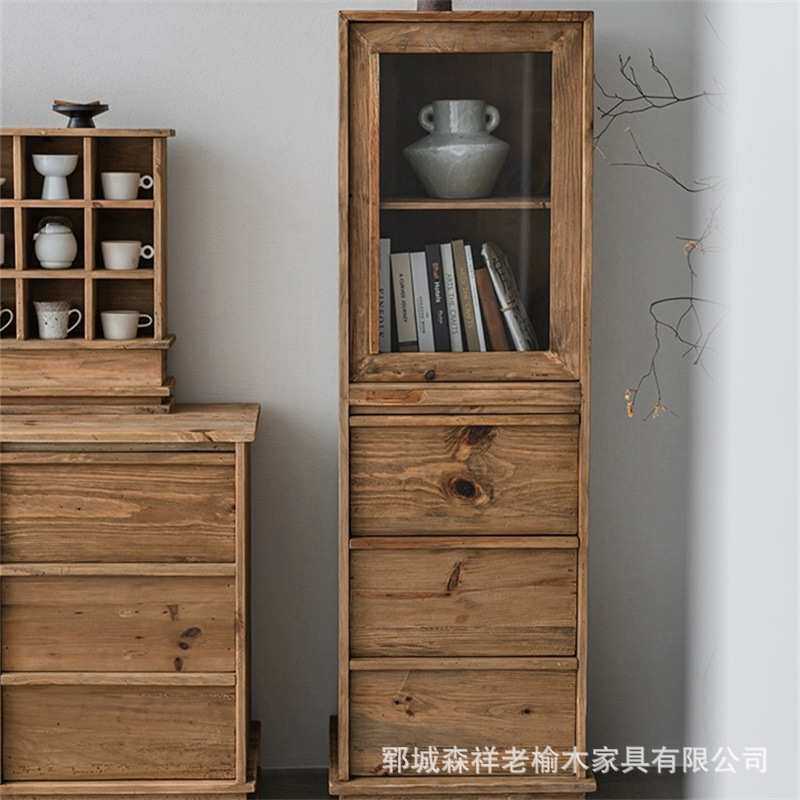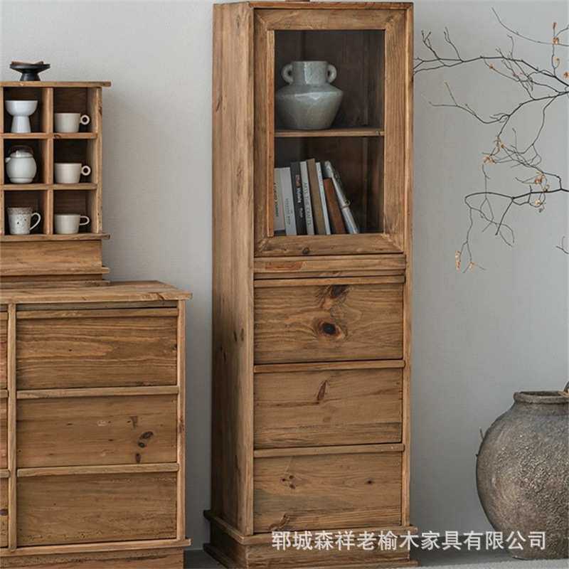 新中式老榆木长方形玻璃斗柜三层抽屉柜榆木书柜卧室储物柜家具
