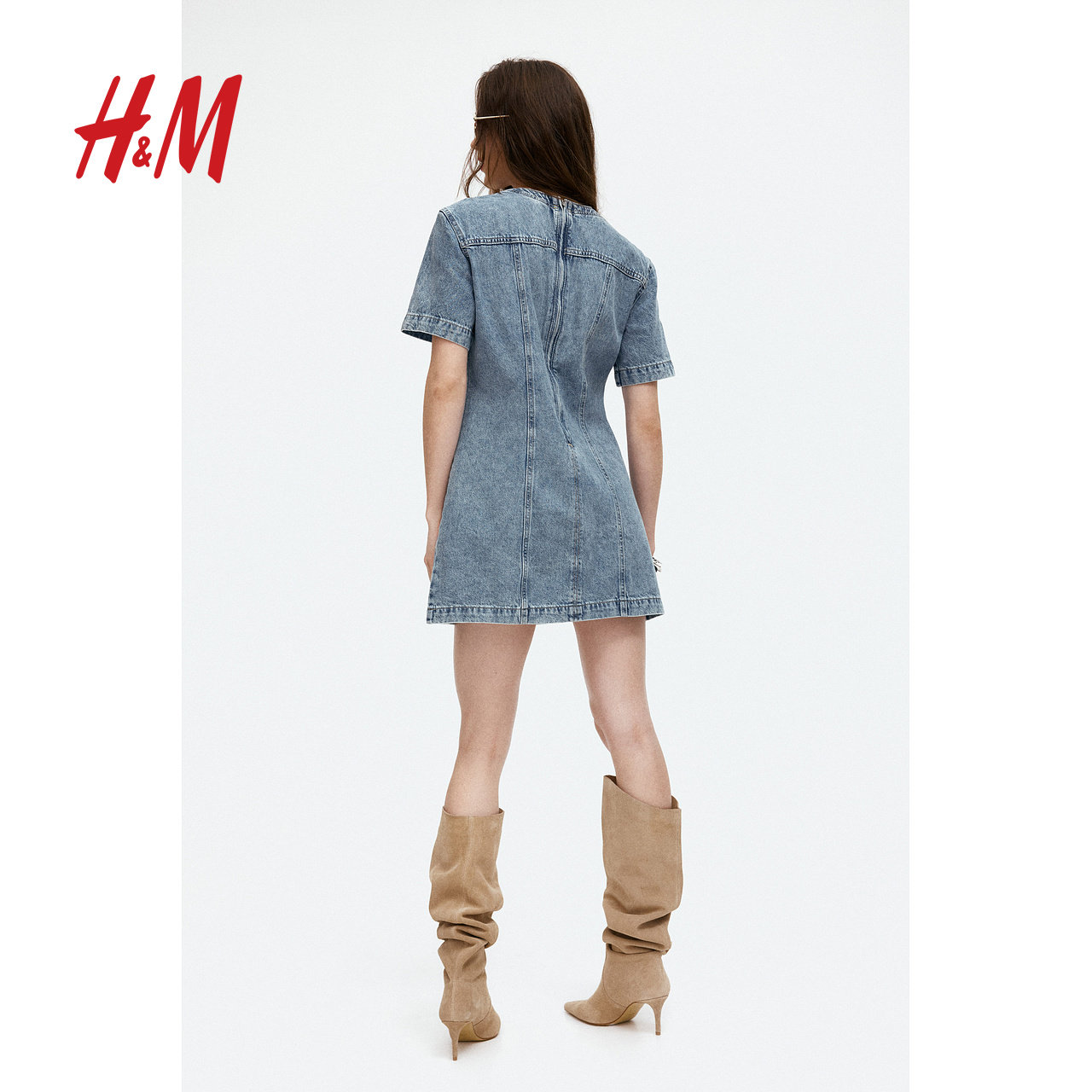 HM女装连衣裙春季短袖直筒裙系带装饰牛仔短裙1270517