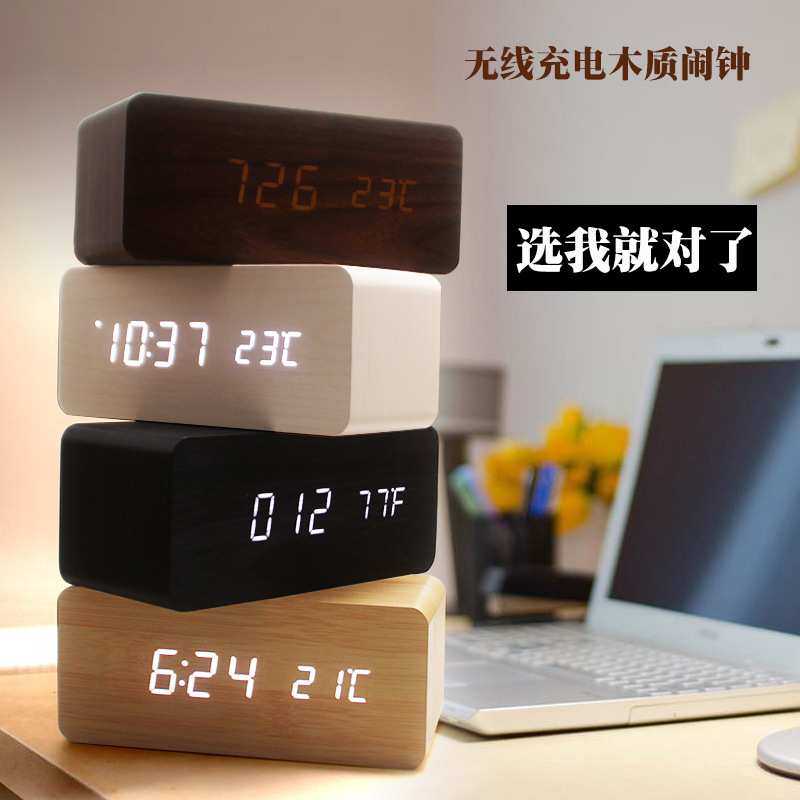 LED木头钟时尚静音无线充电闹钟夜光数字创意声控卧室时钟座钟