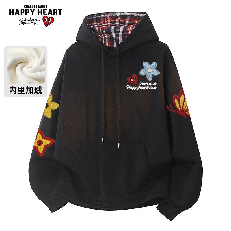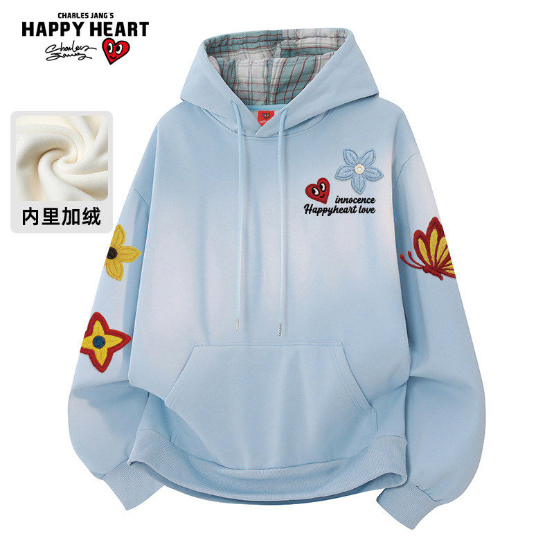 查尔斯桃心美式连帽卫衣男女冬季花卉蝴蝶印花加厚保暖情侣上衣潮