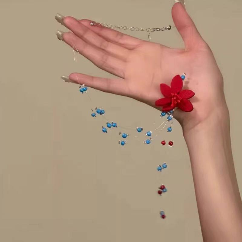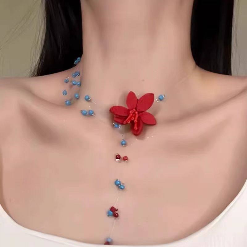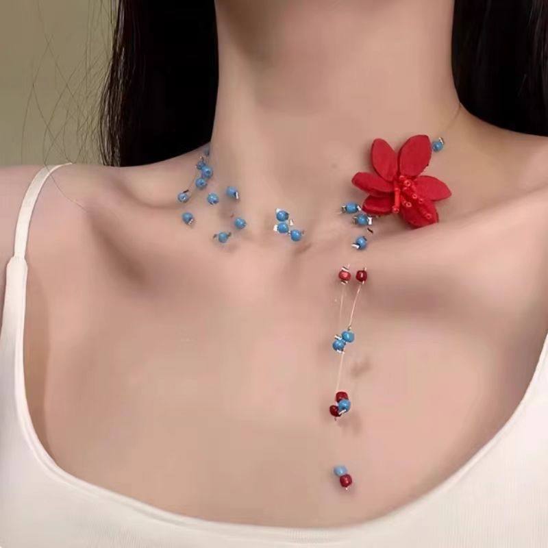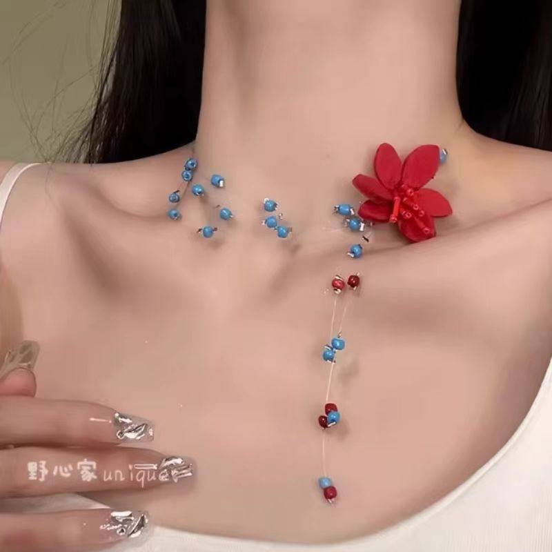 明媚少女春日多巴胺花朵项链2025新款蓝色串珠choker锁骨链红色花
