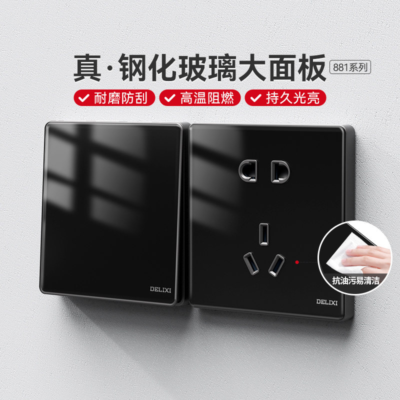 德力西玻璃大板镜面86型五孔三插双控单开墙壁开关插座面板881黑