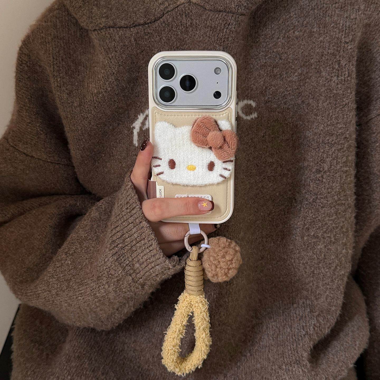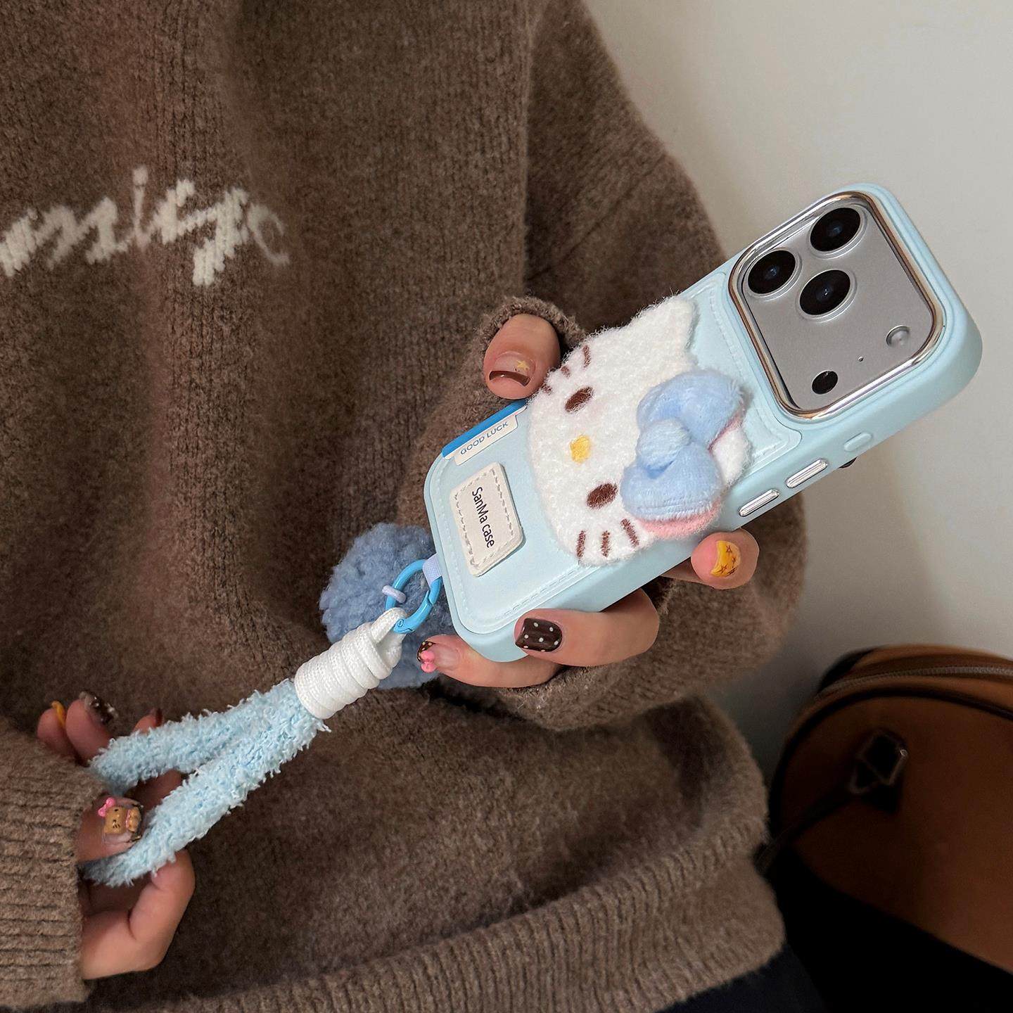 秋冬鼓包皮质贴皮毛绒蝴蝶结kitty适用苹果17promax手机壳iPhone16新款15promax挂绳女款14防摔13保护套