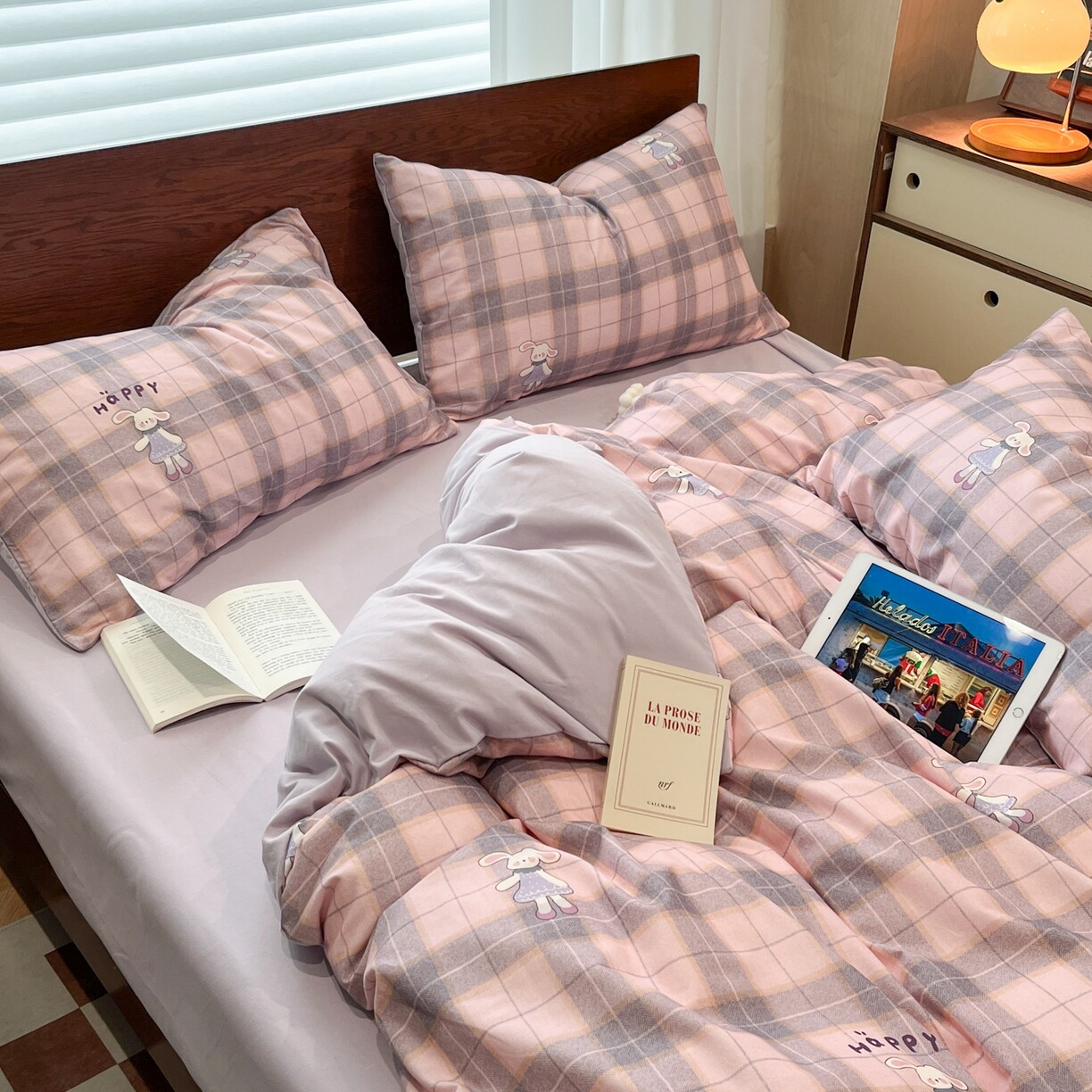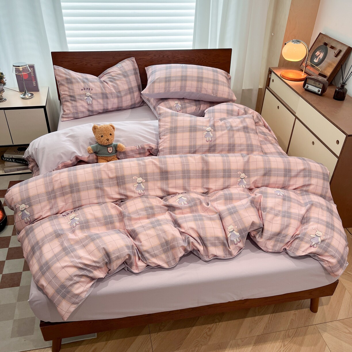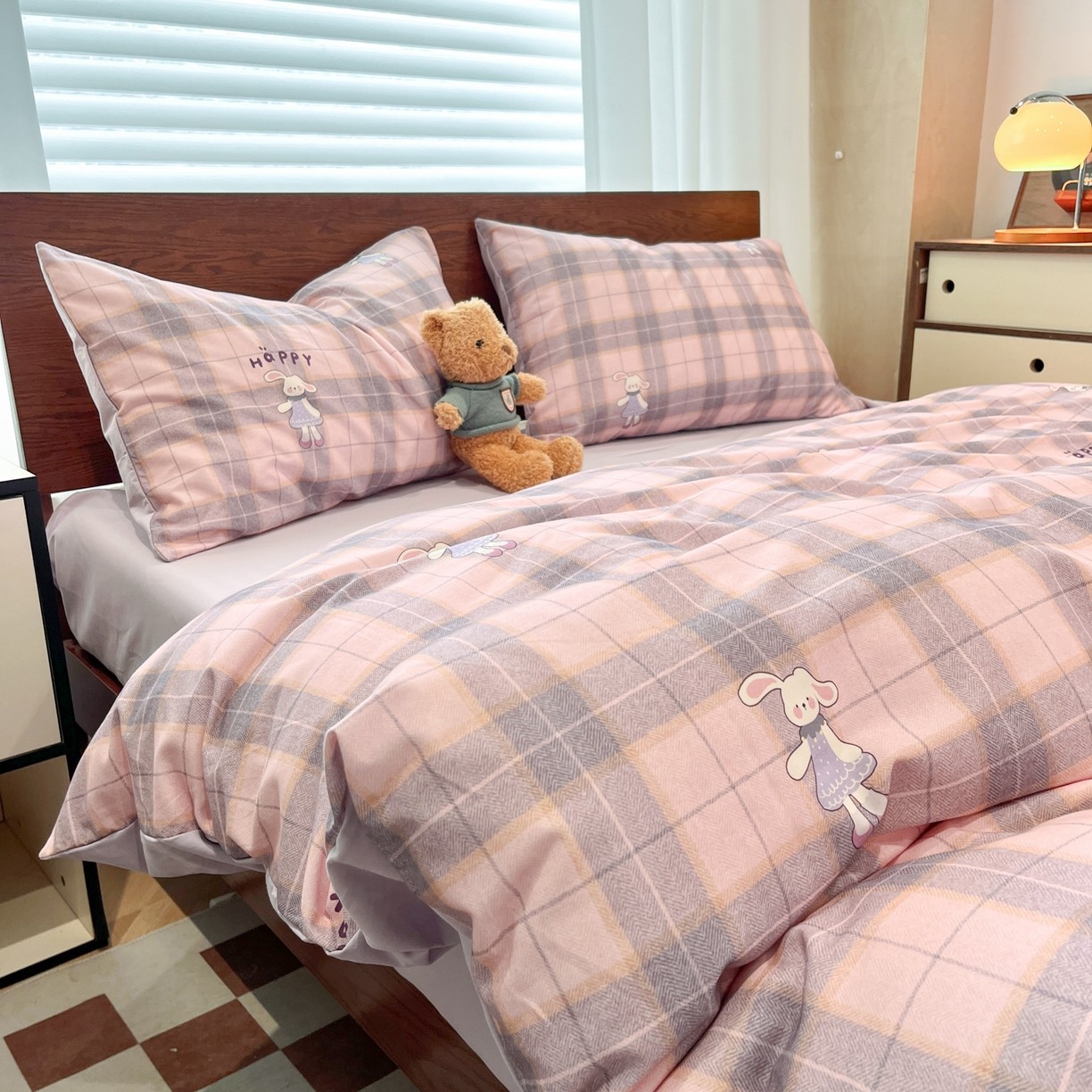 寒念新品美拉德卡通全棉纯棉磨毛四件套格子床品套件床上用品斜纹