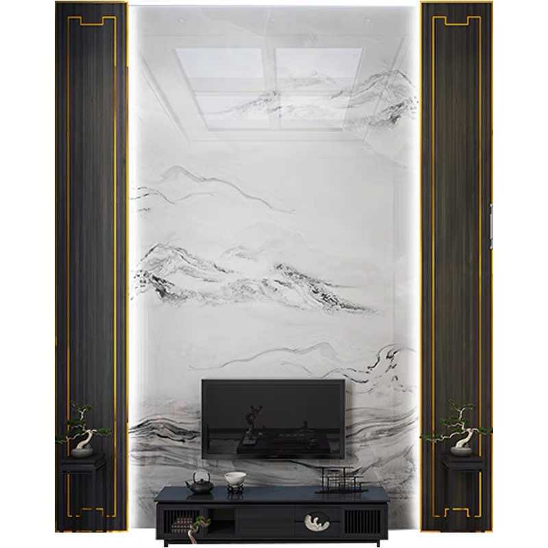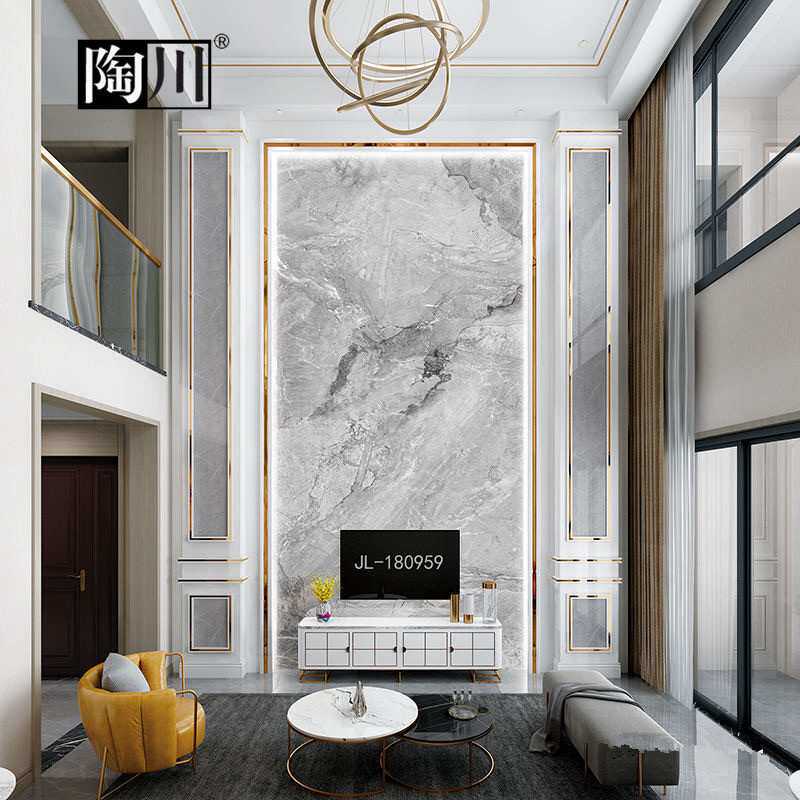 复式楼岩板背景墙别墅楼中楼微晶石瓷砖罗马柱新中式仿大理石客厅