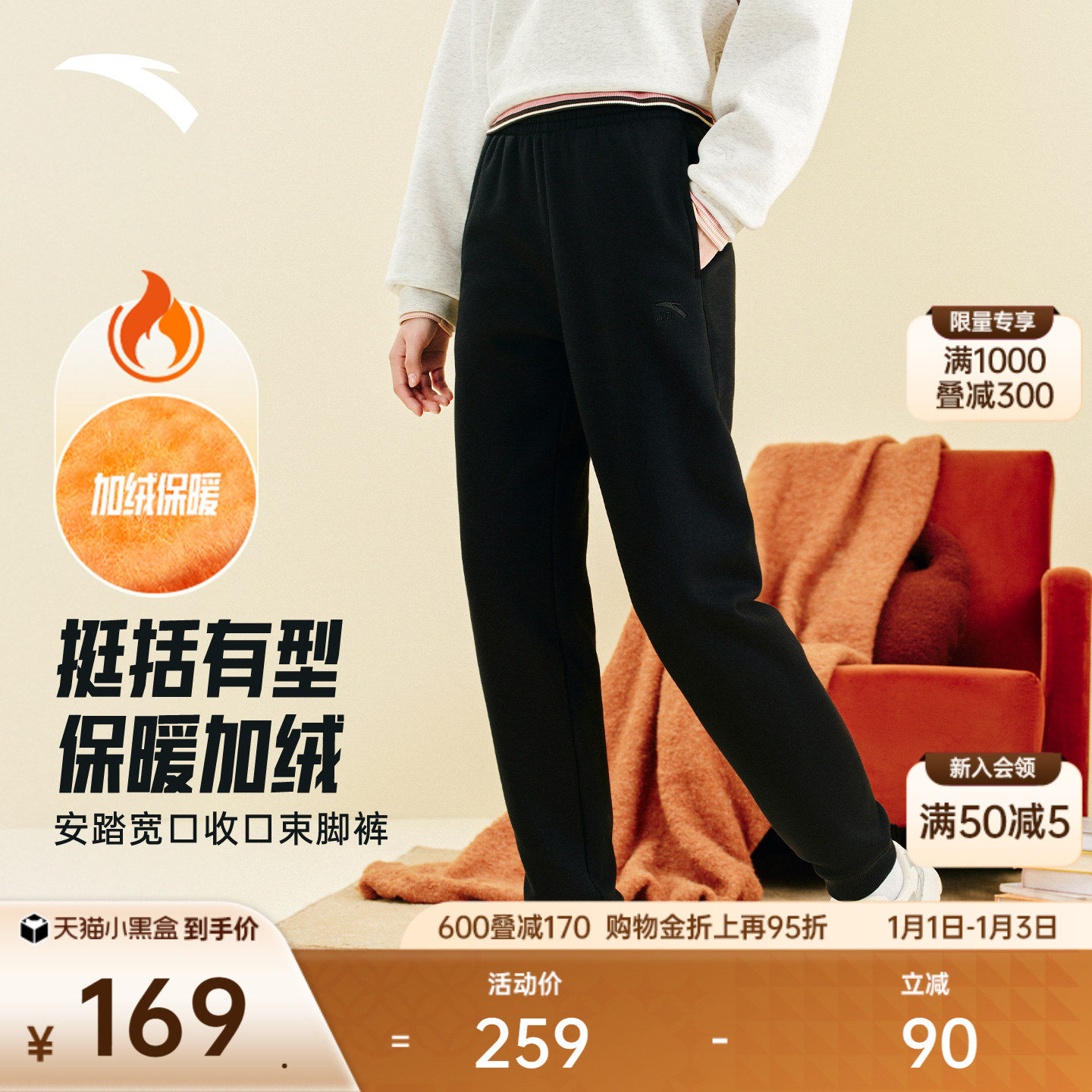 安踏运动卫裤女冬季新款加绒针织束脚裤黑色休闲长裤子162548302N