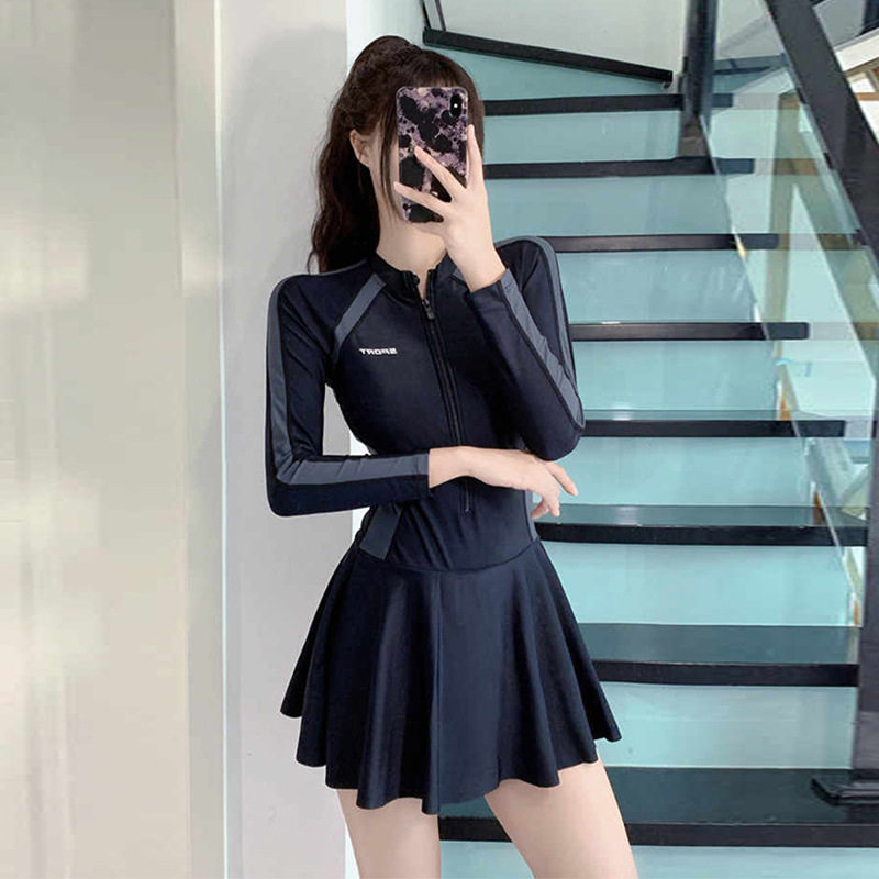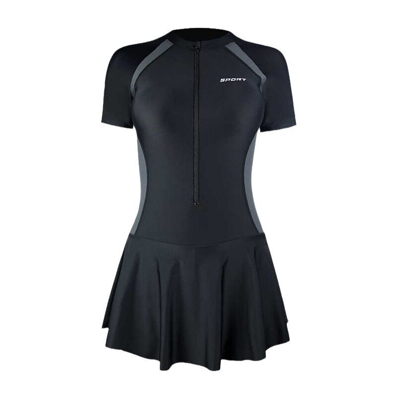 泳衣女款运动连体拼接温泉泳装保守显瘦连衣裙式简约修身度假泳衣