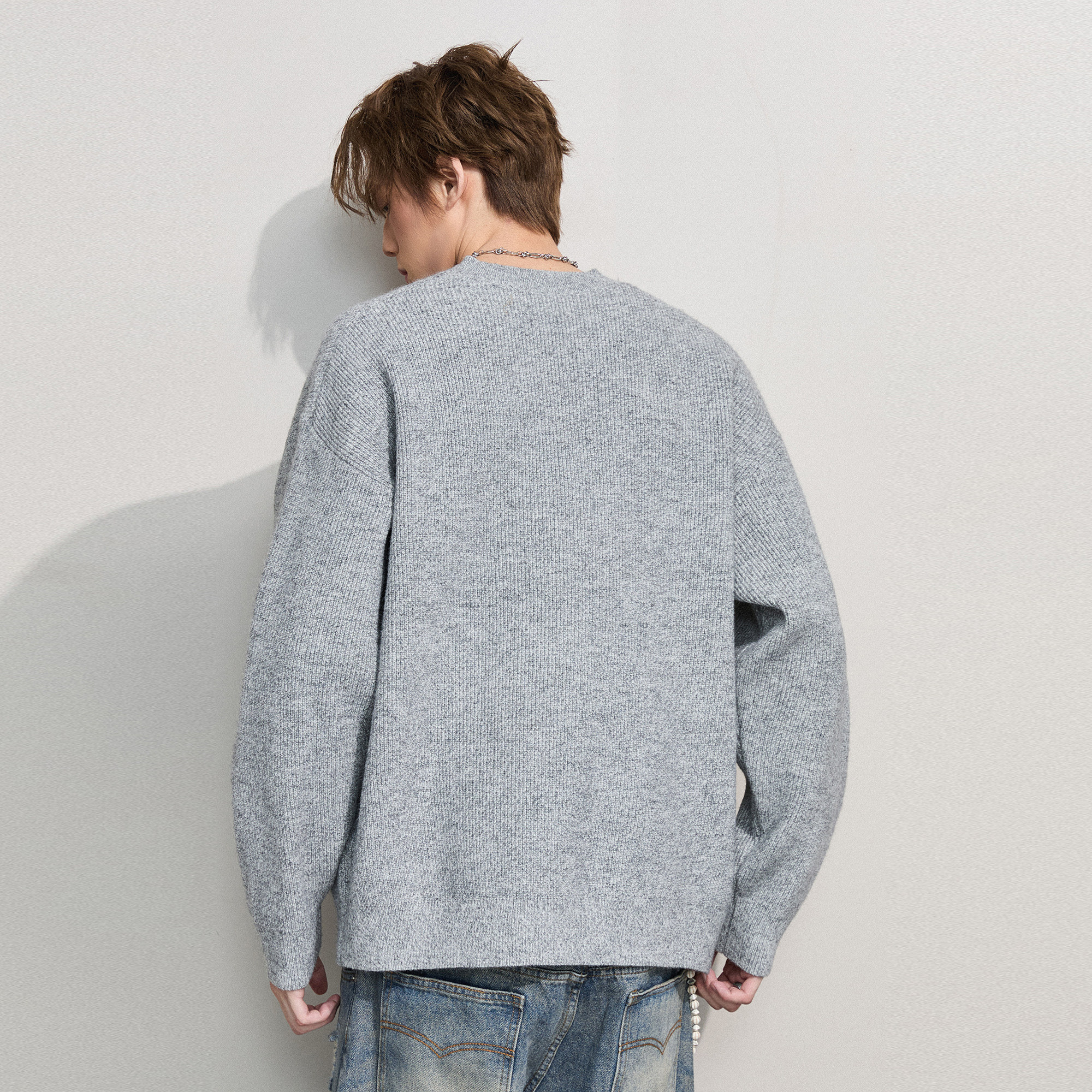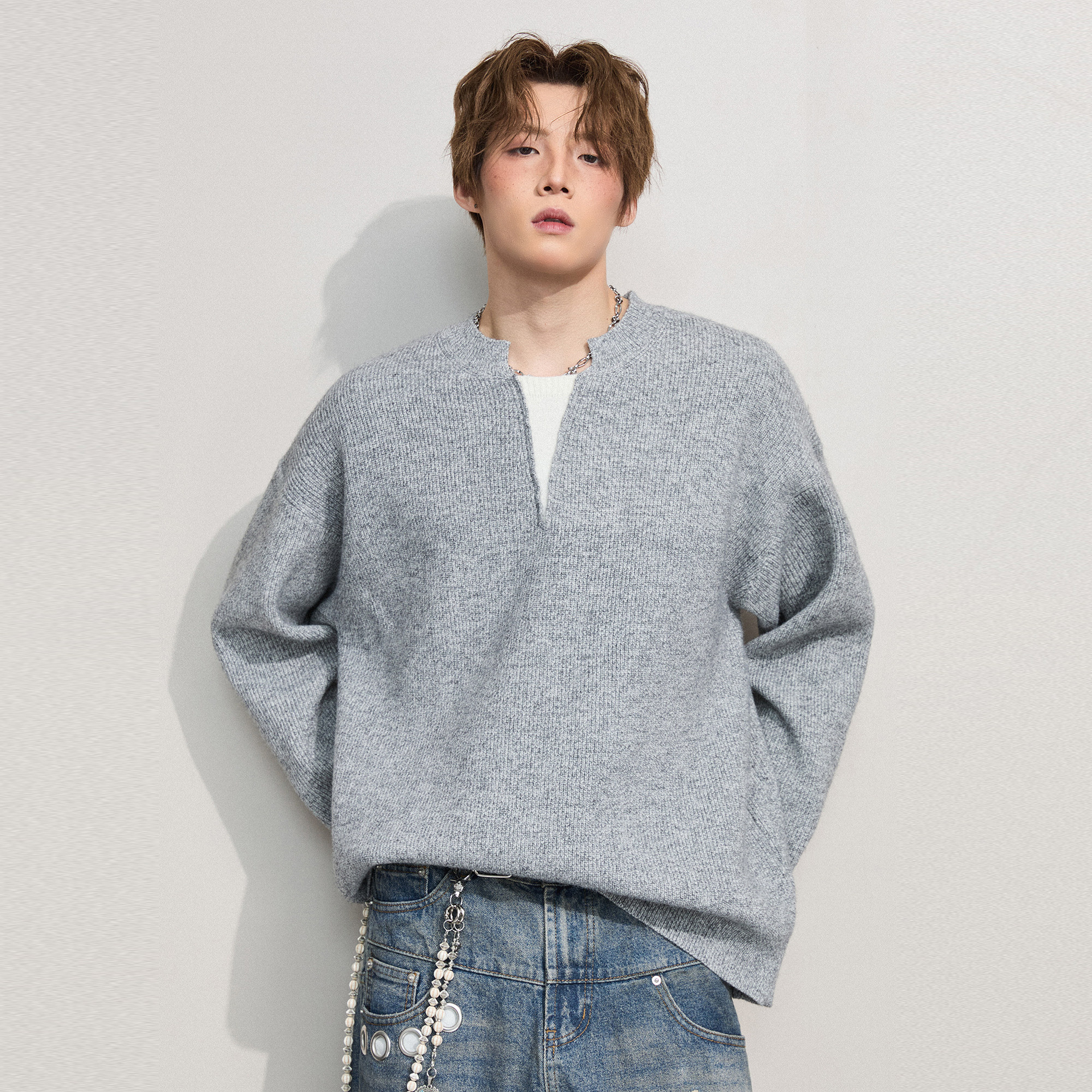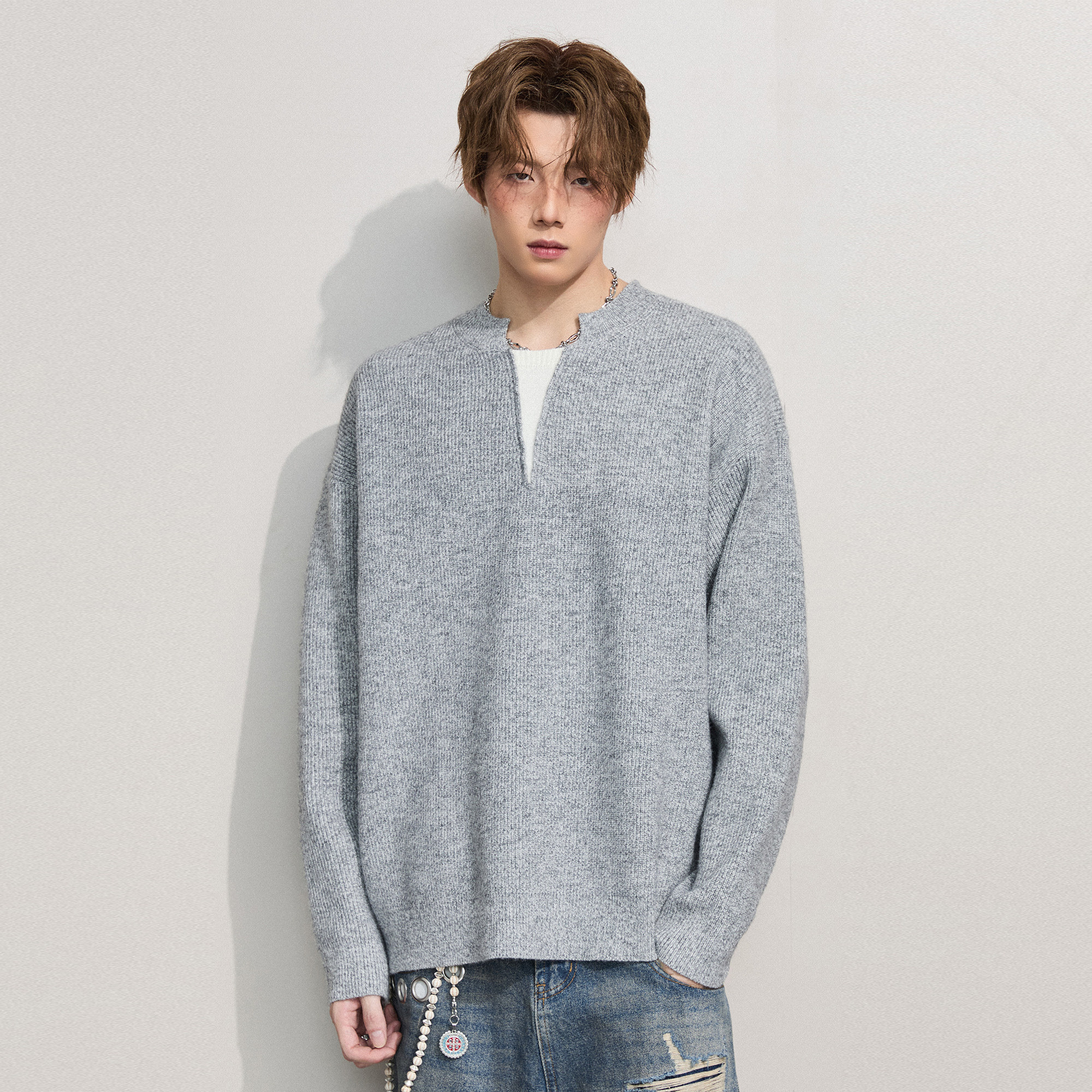 NOFUNNULL 美式亨利领纽扣套头毛衣男秋冬宽松休闲圆领针织衫上衣