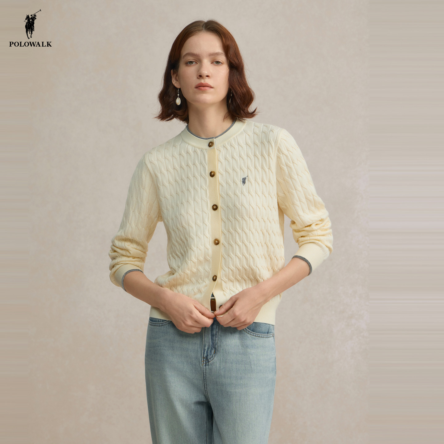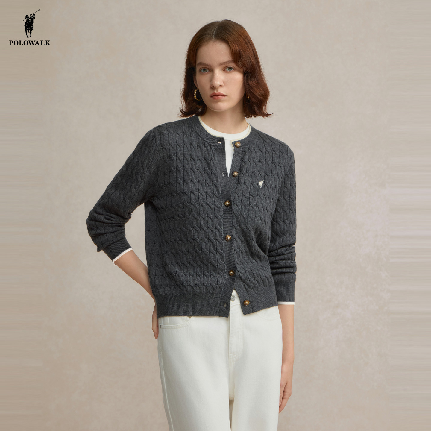 【含绵羊毛】POLOWALK长袖针织衫女士2025秋季新品绞花针织开衫女