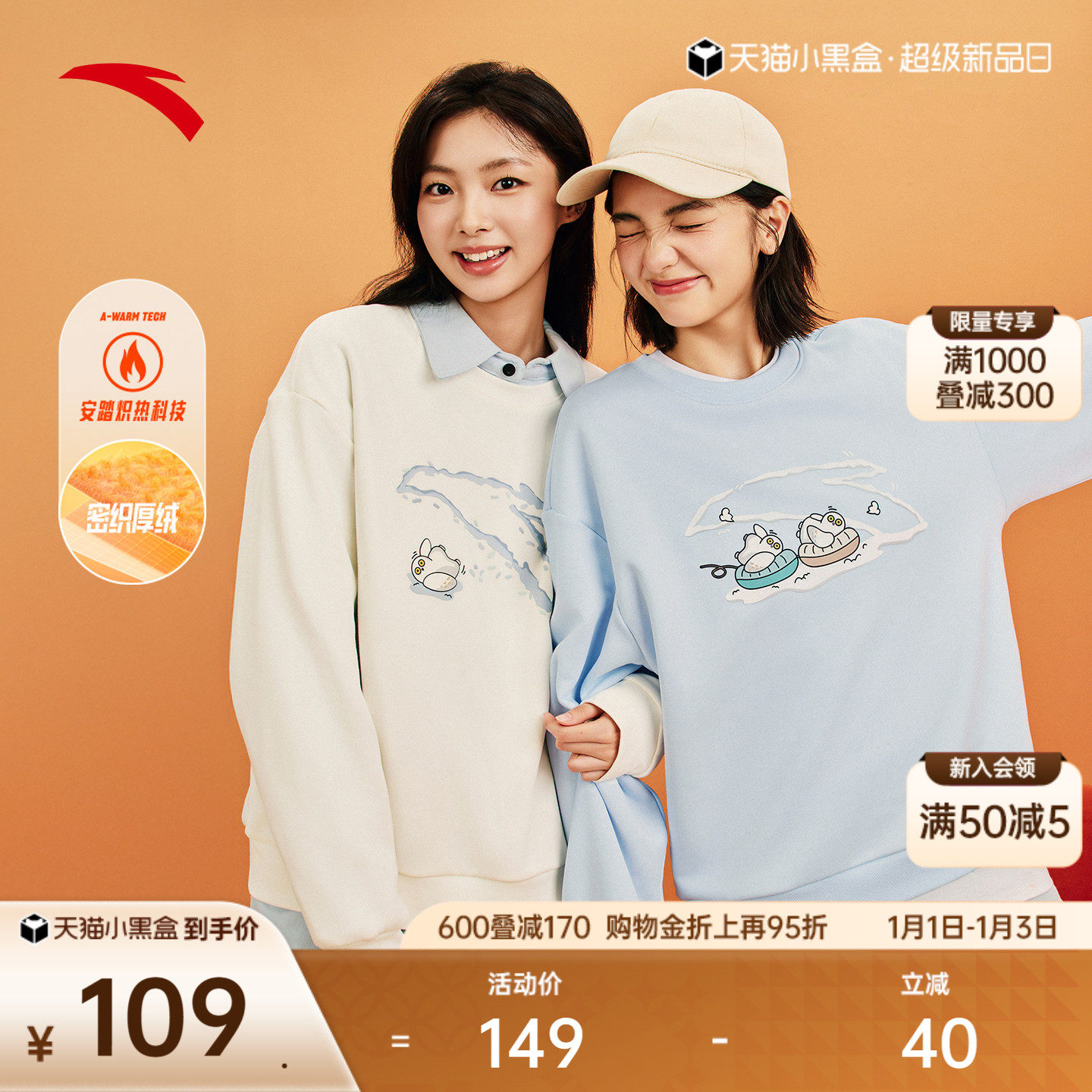 安踏雪鸮卫衣丨减龄套头衫女冬季新款加绒休闲宽松多巴胺运动上衣