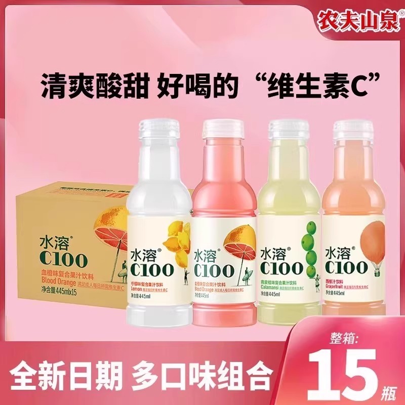 农夫山泉水溶C100柠檬味复合果汁饮料445ml*15瓶整箱维生素饮料