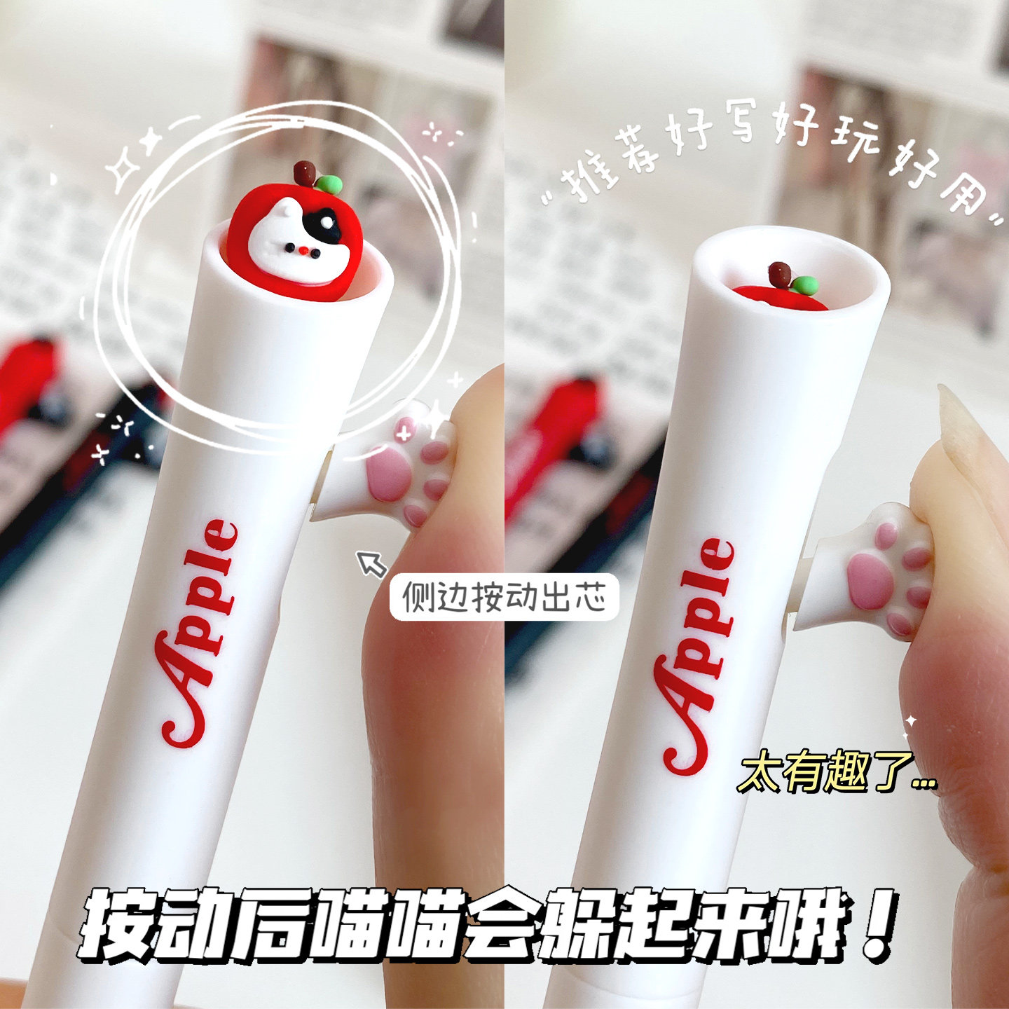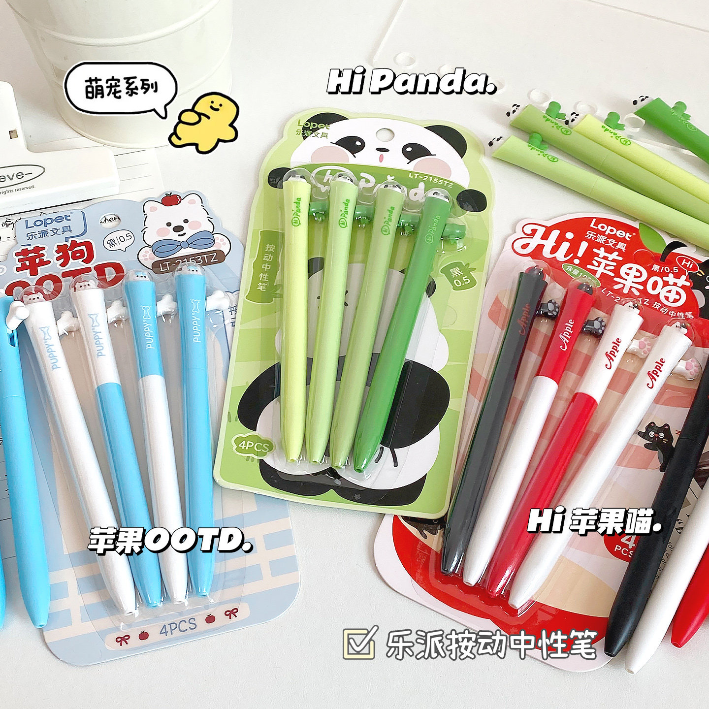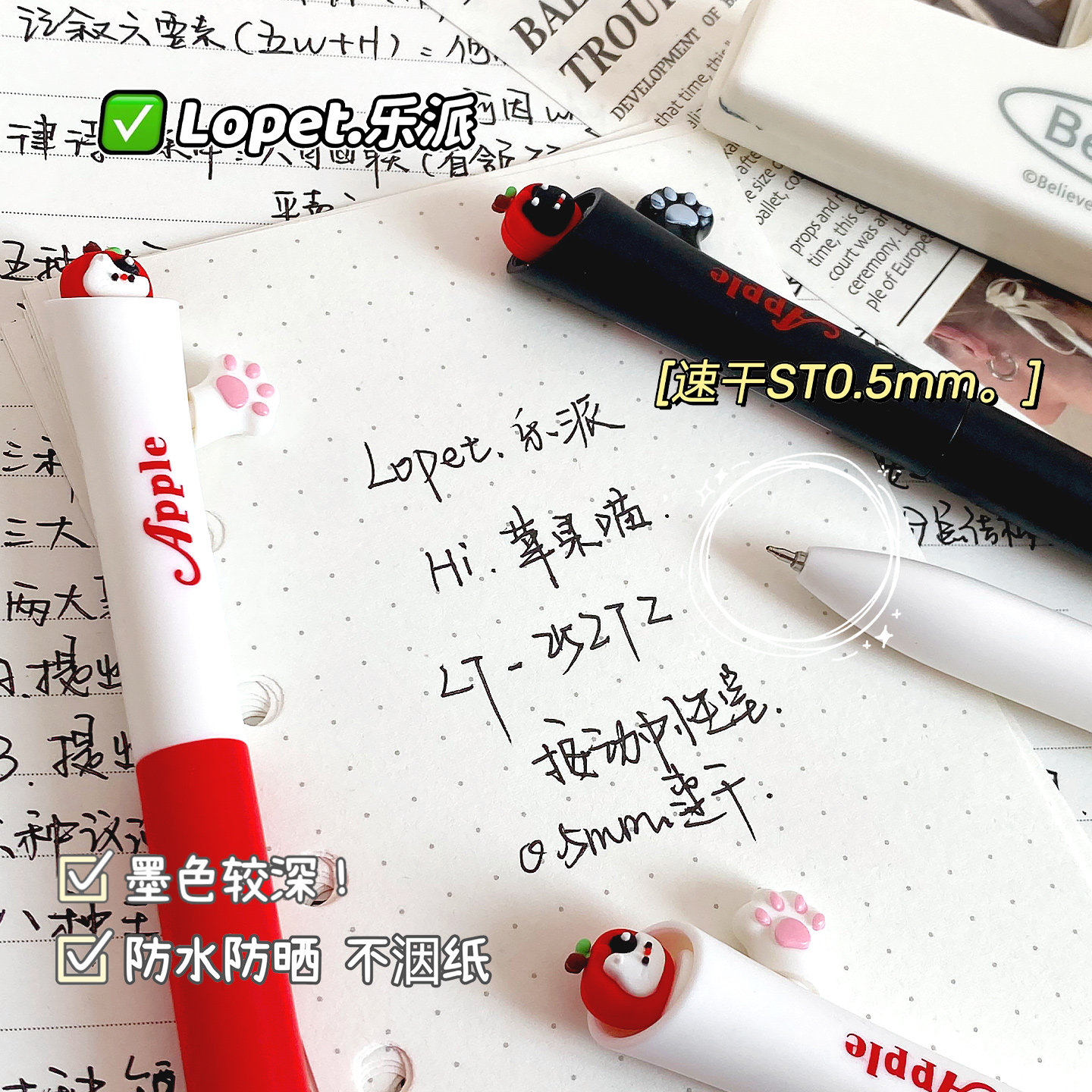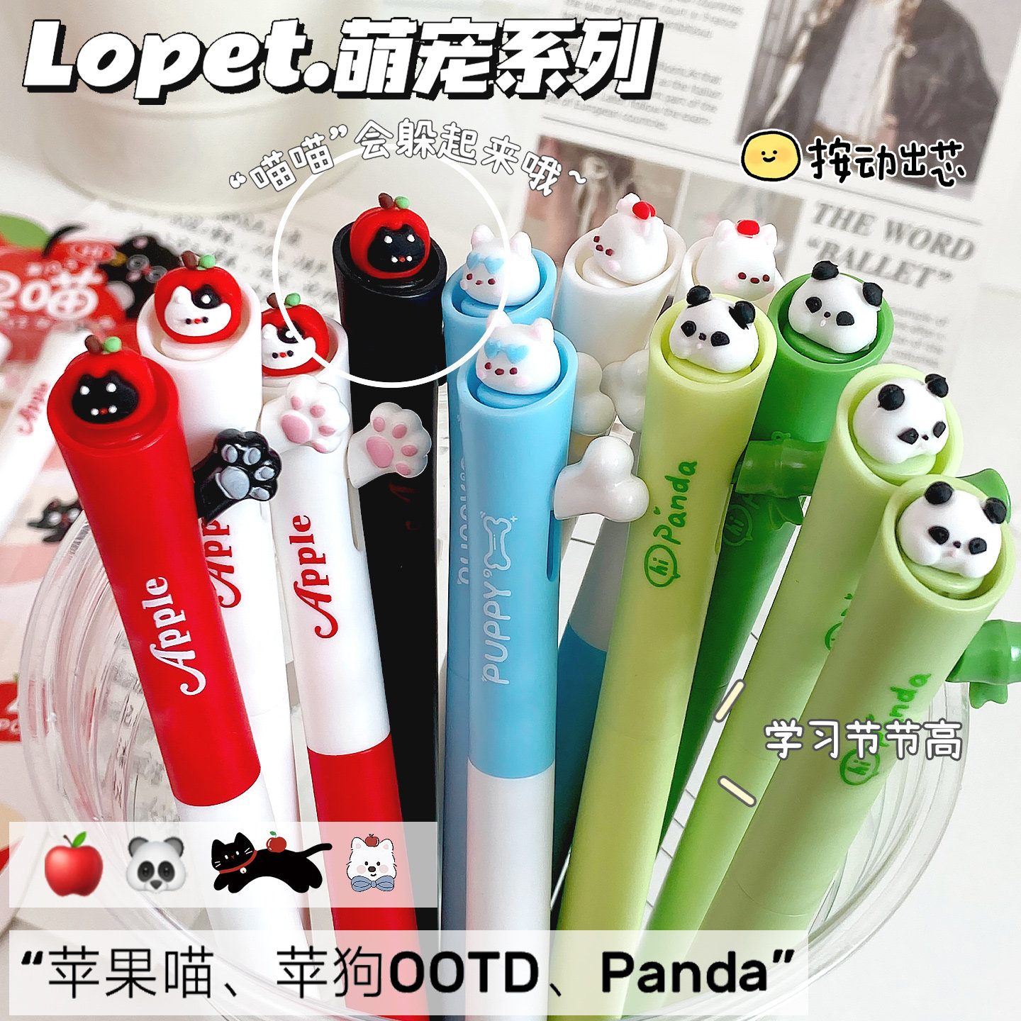 lopet【苹果喵喵】可爱卡通动物按动中性笔套装学生用手账刷题作业考试专用记笔记签字笔顺滑速干黑解压好玩