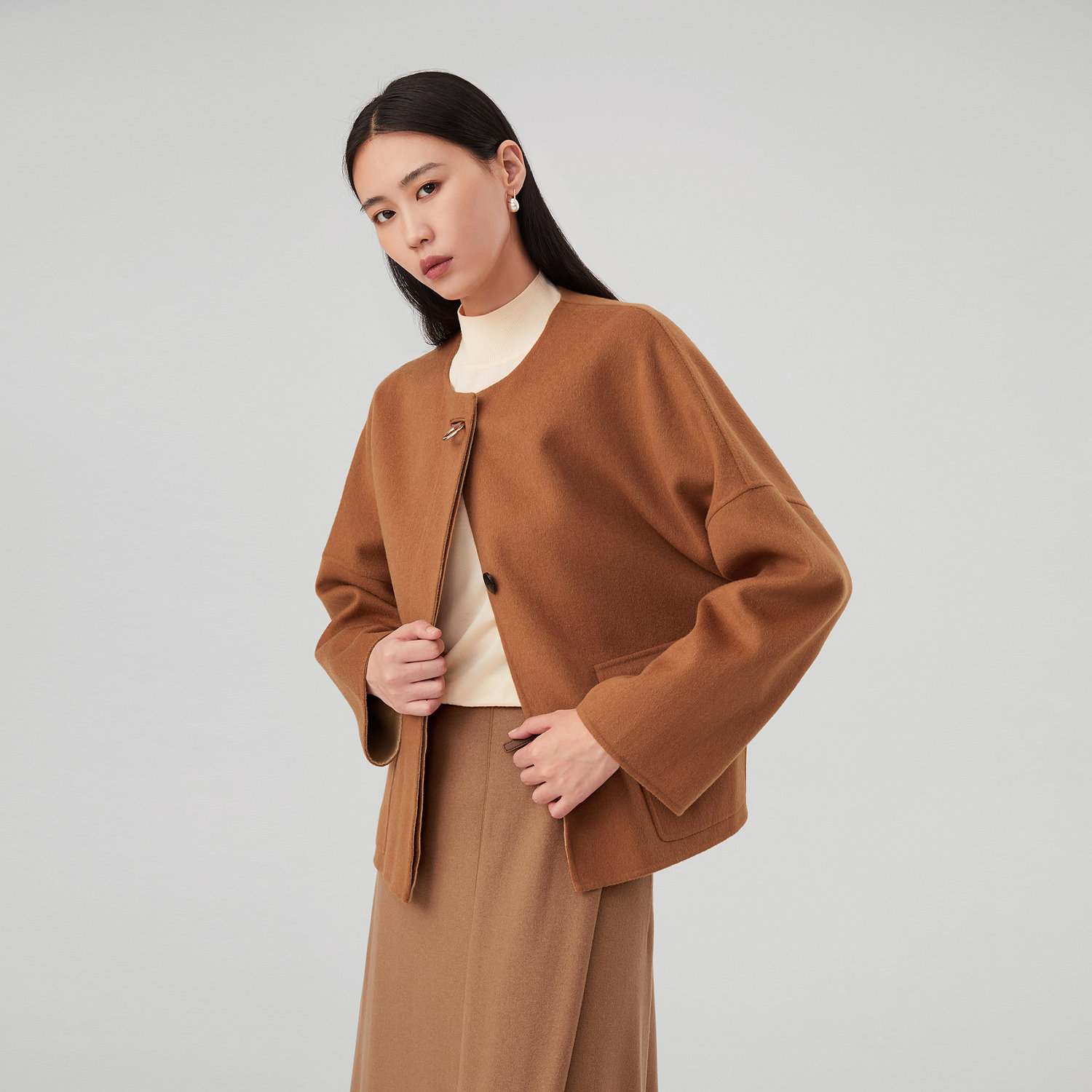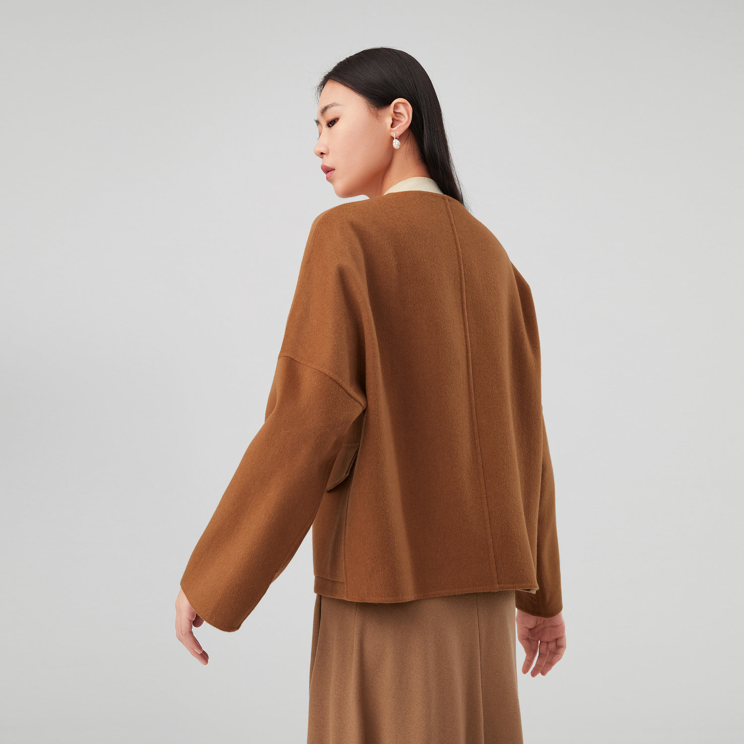 混纺面料 双面异色呢 圆领设计