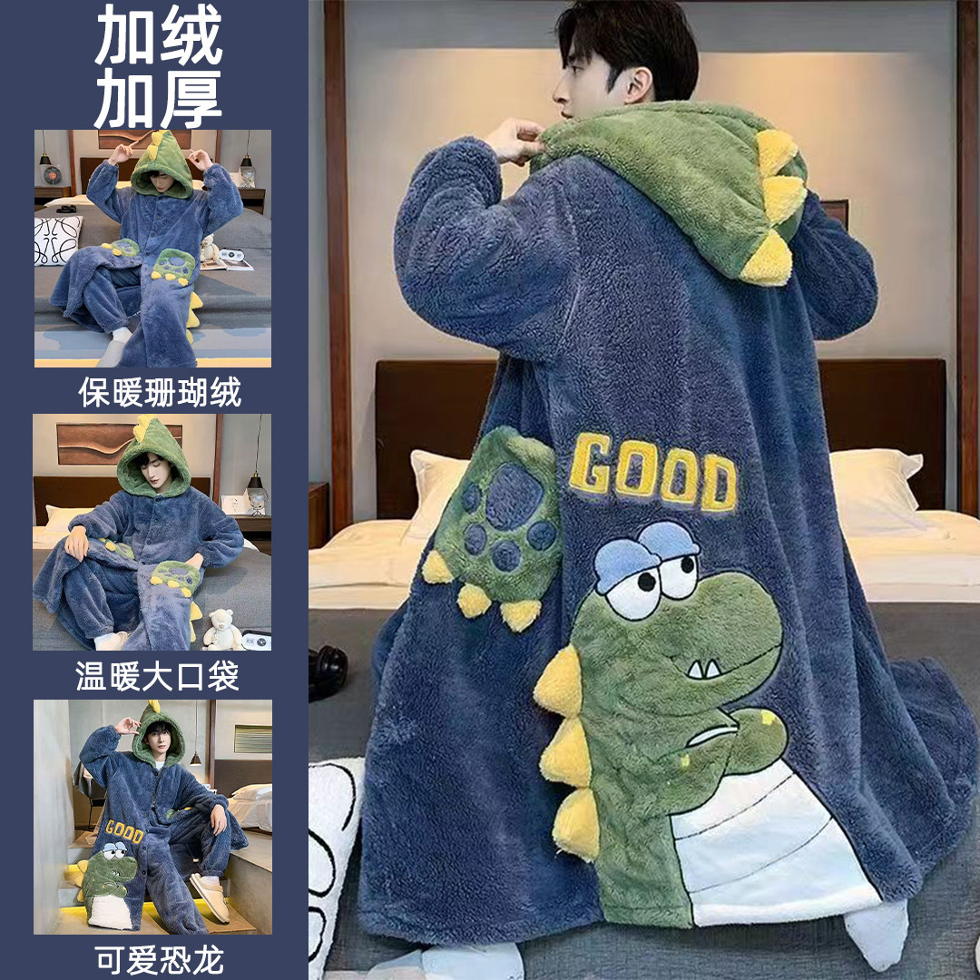 男士珊瑚绒睡袍女款2026新款冬季加厚青少年家居服加绒可外穿鲨鱼