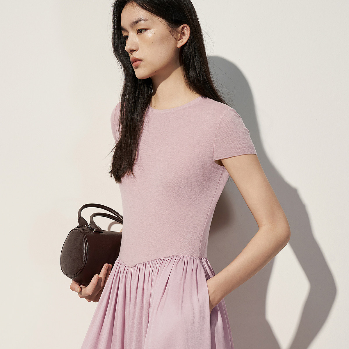 【热销补货】欧时力 褶皱短袖连衣裙女2026春新款收腰显瘦小黑裙