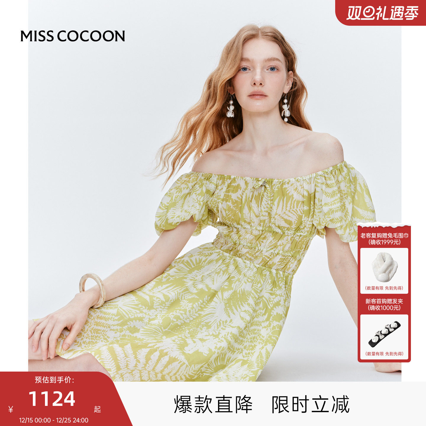 MISS COCOON可可尼苎麻印花泡泡袖连衣裙女2025秋季新款度假裙子