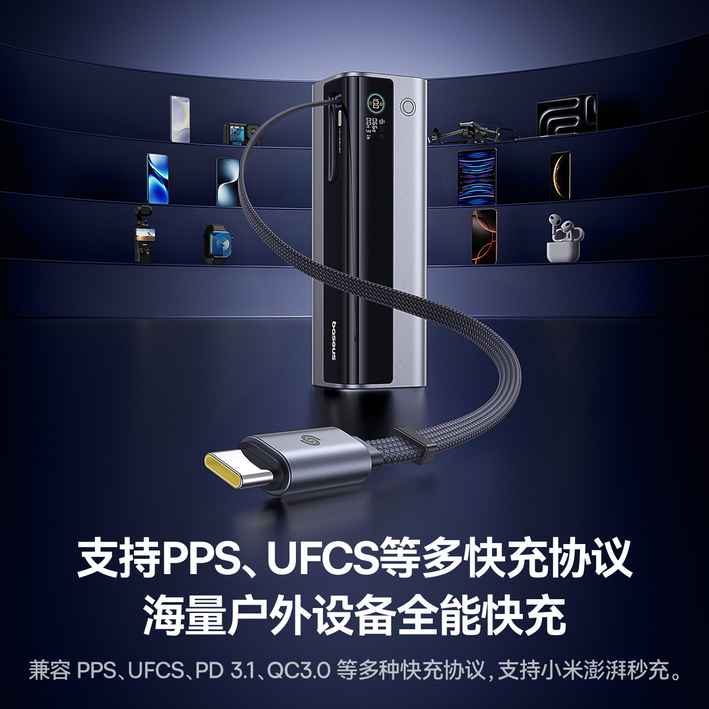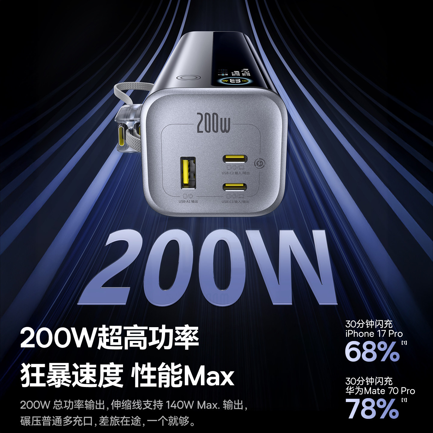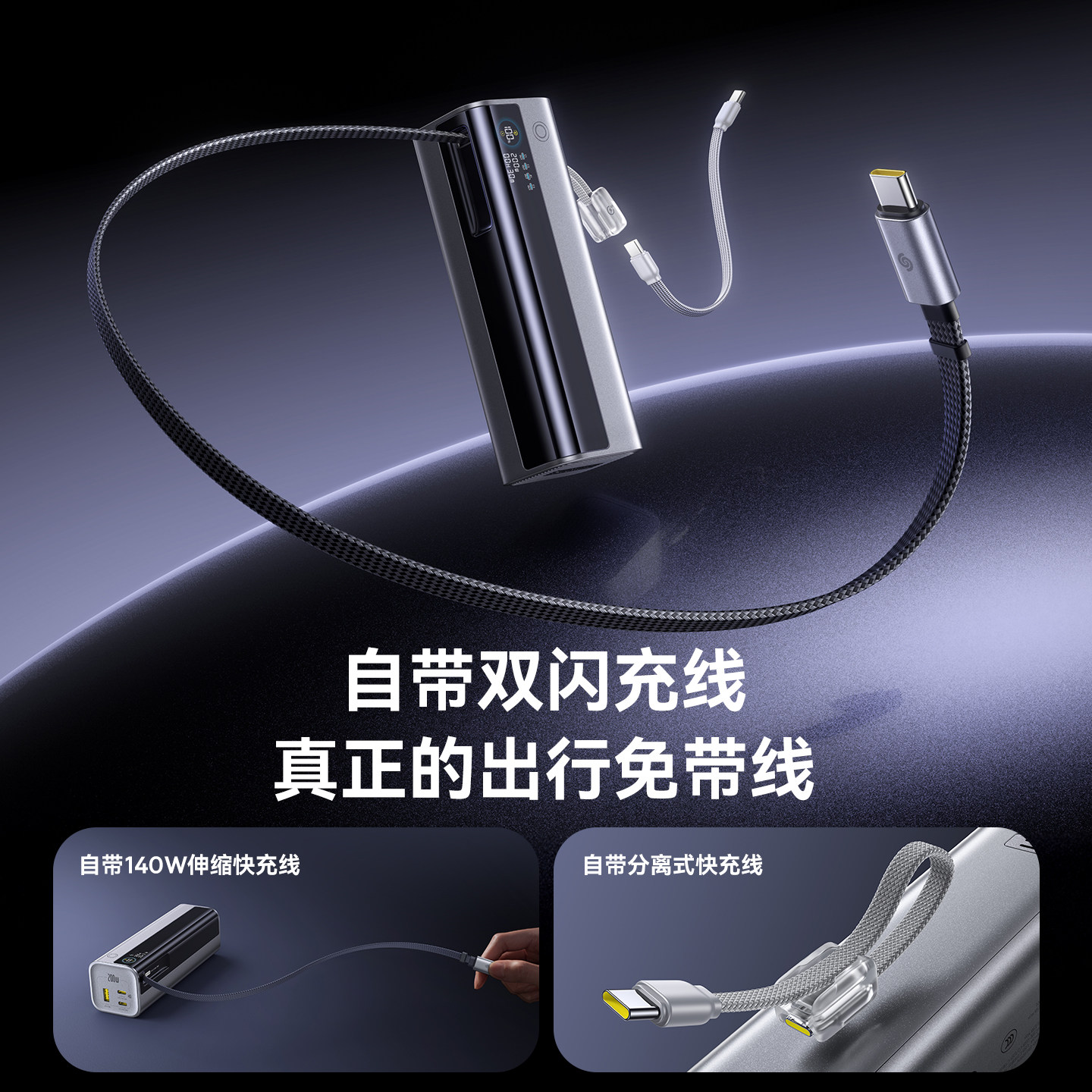 [充电宝3c认证可上飞机]倍思200W高功率大容量2026新款快充移动电源自带伸缩线20000毫安适用苹果笔记本电脑