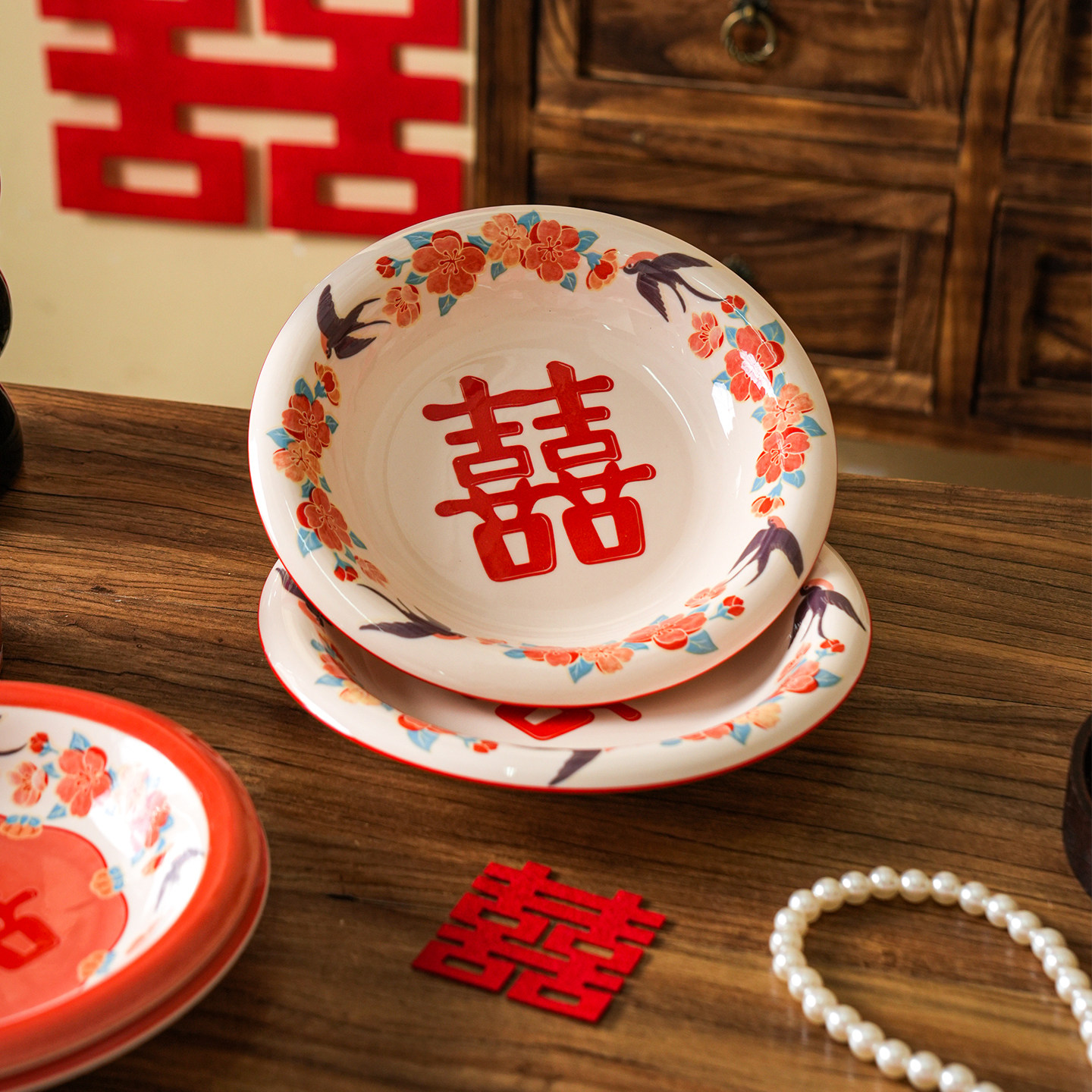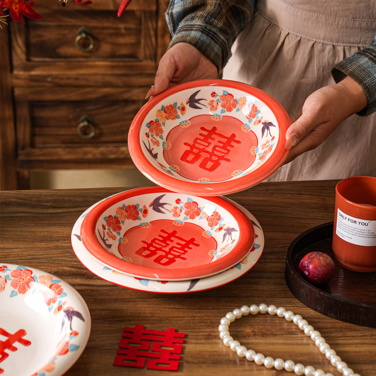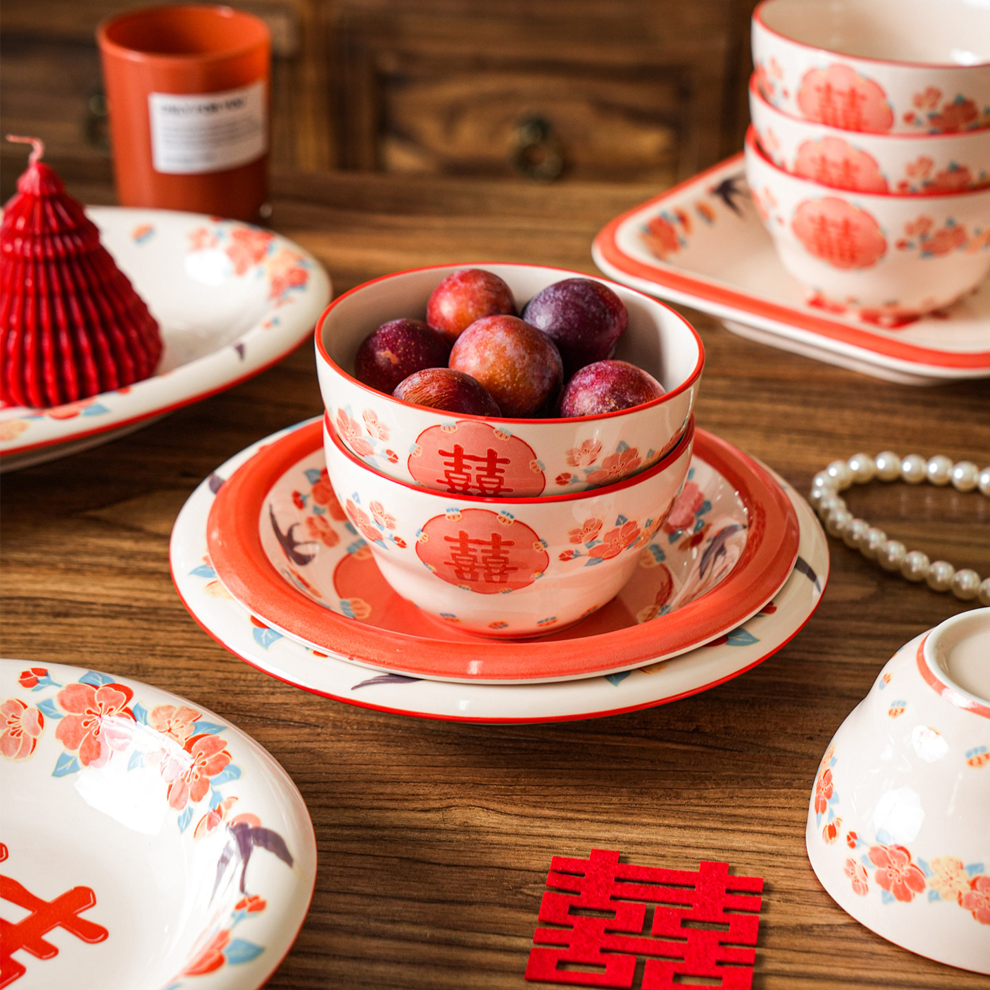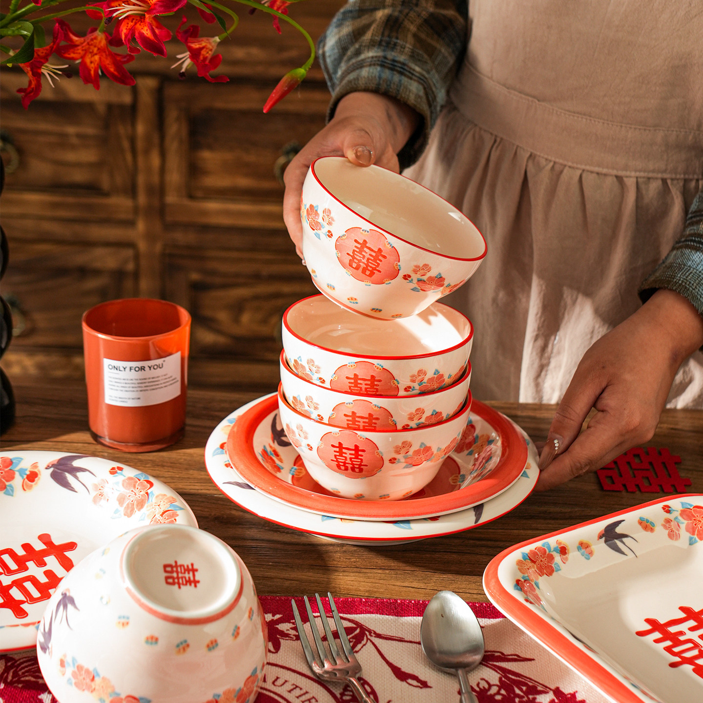 舍里喜庆餐具套装釉下彩喜字米饭碗菜盘子碗碟组合结婚礼物送新人