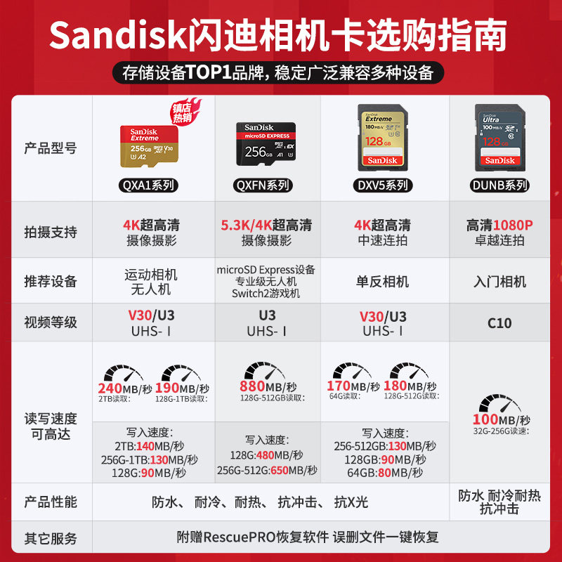 闪迪512G内存卡运动相机卡大疆pocket3存储卡sd卡无人机TF卡