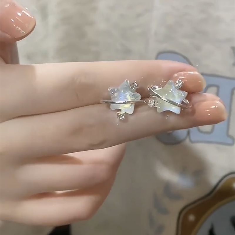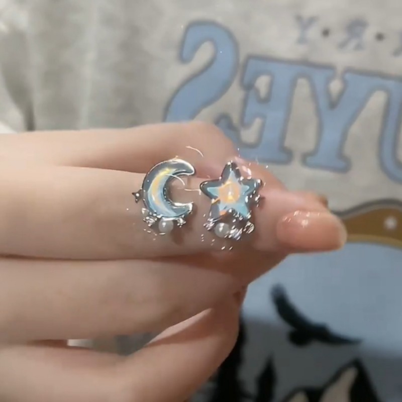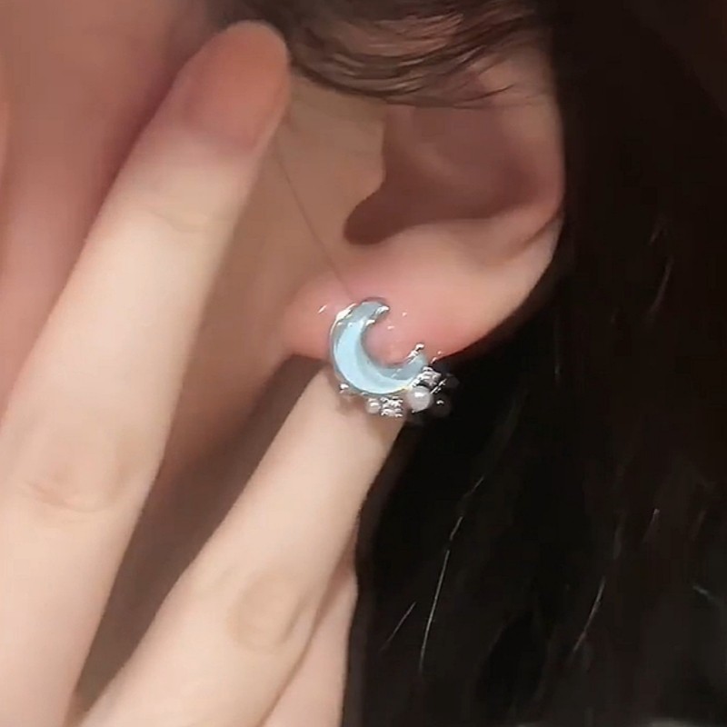 森系小清新蓝色星月耳夹女小巧百搭无耳洞耳环珍珠锆石不对称耳饰