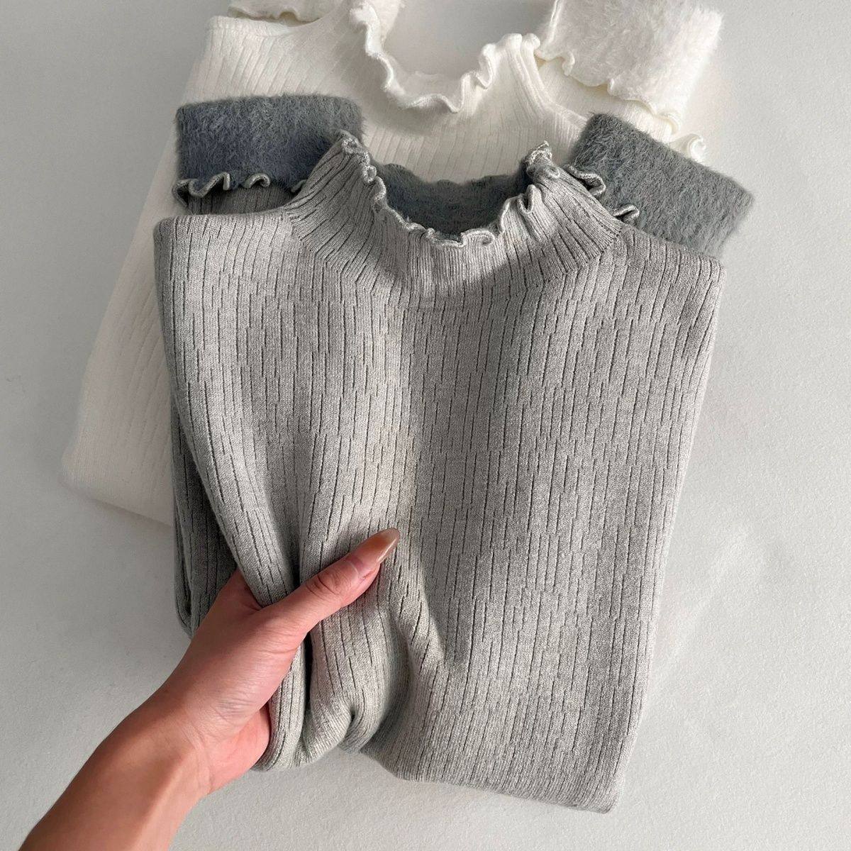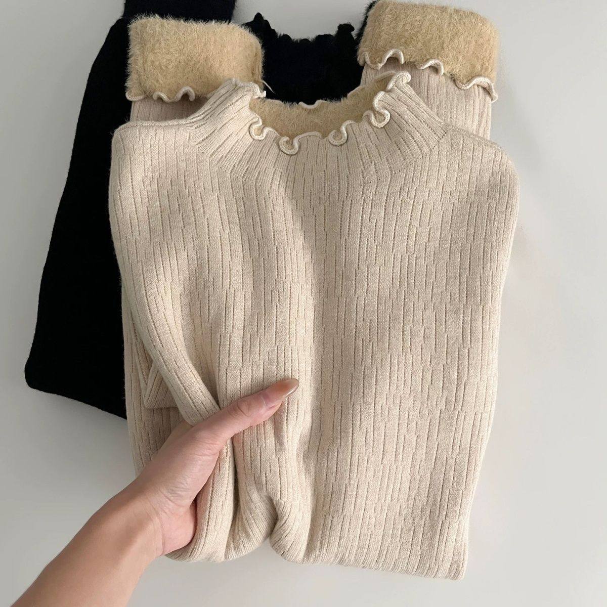 半高领木耳边毛衣秋冬加绒加厚打底衫女大码内搭纯色冬季针织上衣