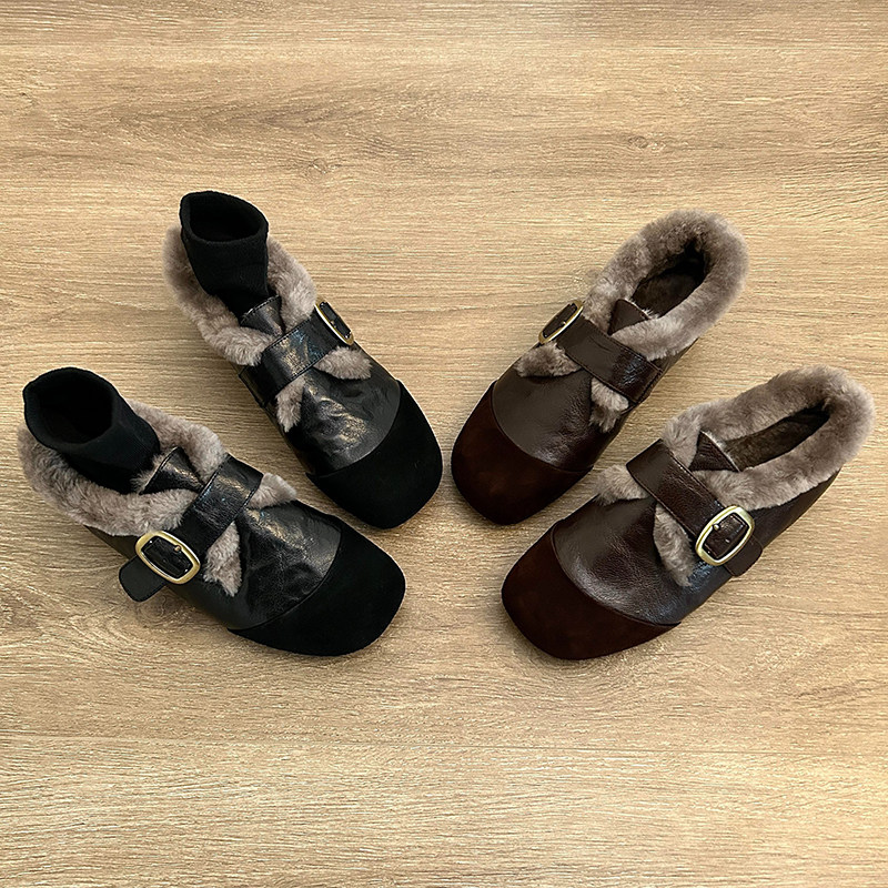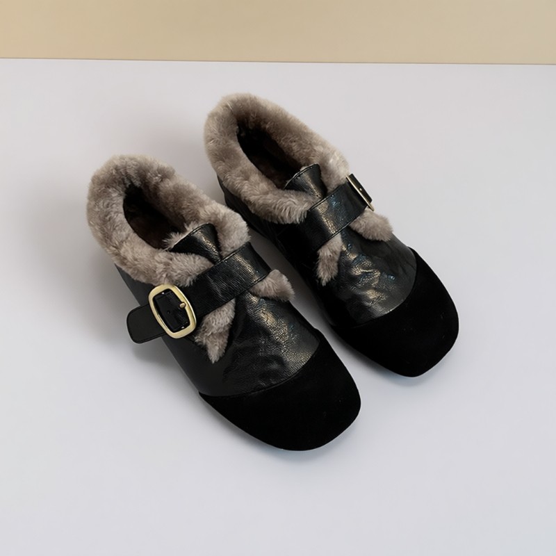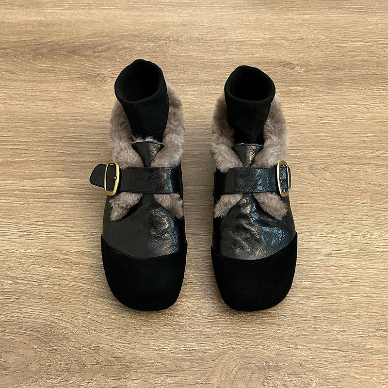 羊皮版复古玛丽珍鞋女方头秋冬季加绒保暖毛毛棉鞋平底晚晚单鞋女