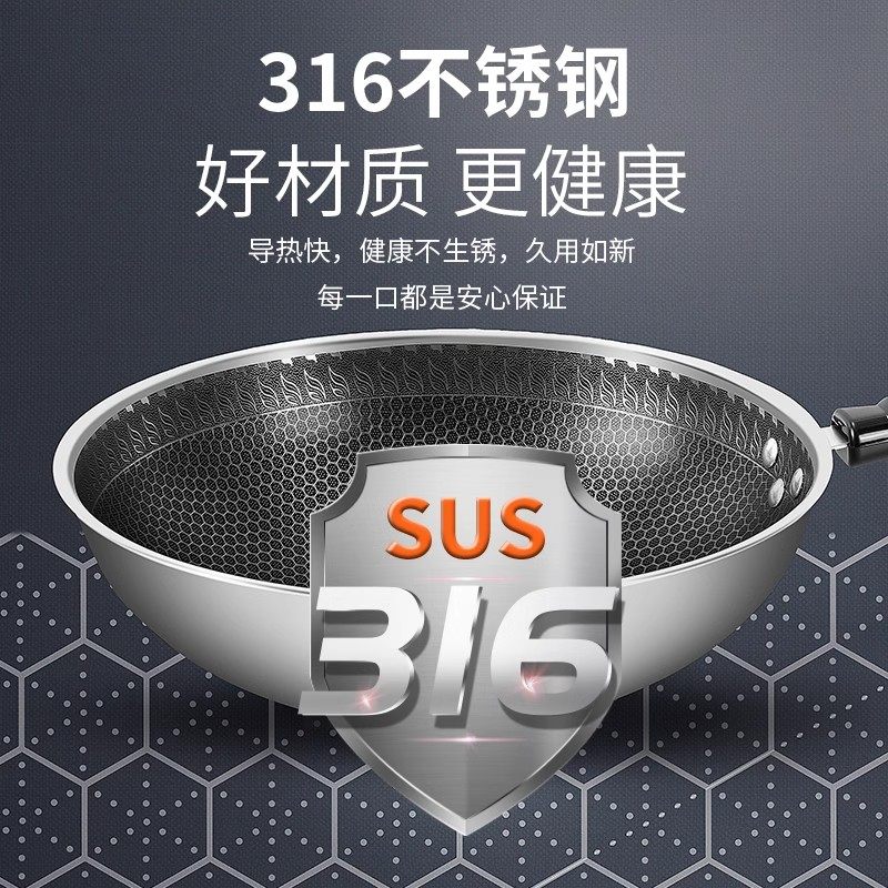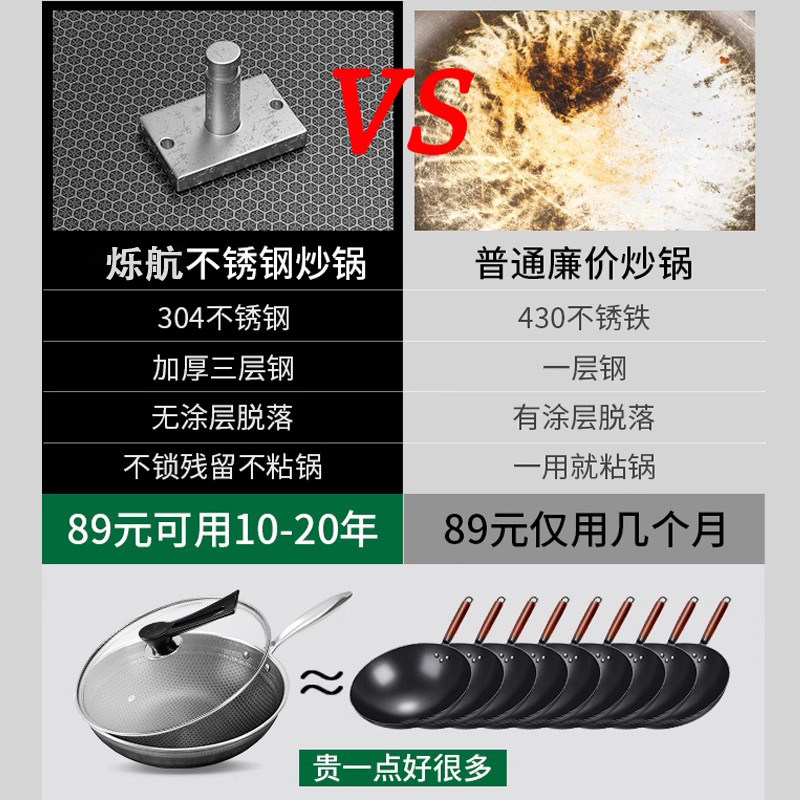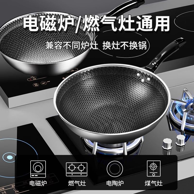 304加厚不粘锅炒锅家用炒菜锅平底电磁炉煤气灶专用不锈钢锅具
