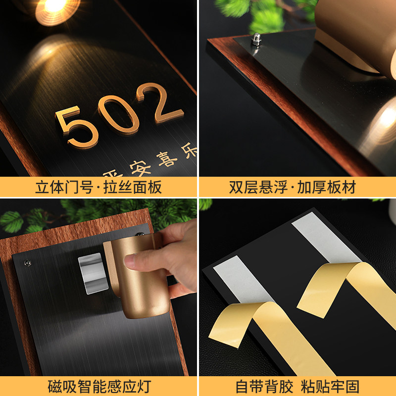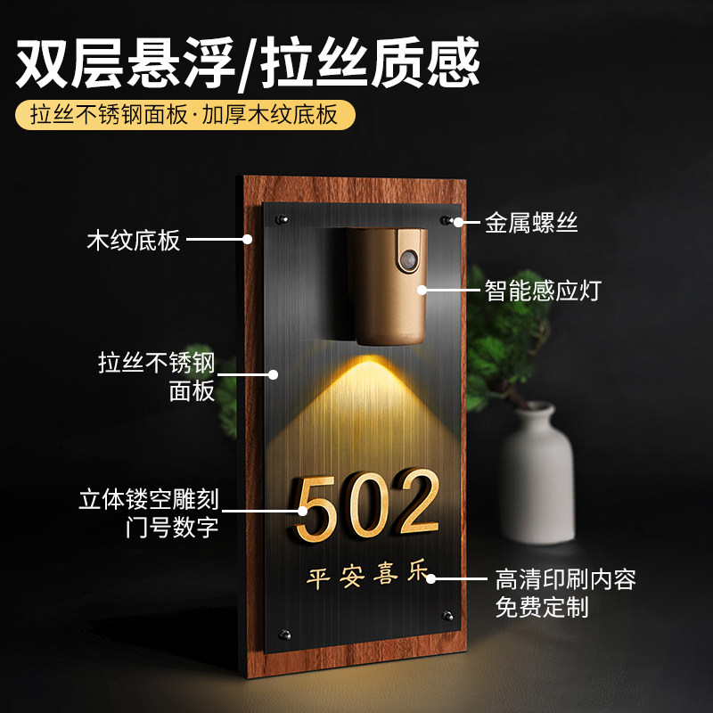 门牌号高级感轻奢创意中古风号码牌定制家庭入户意式极简装饰家用入门进门磁吸感应灯不锈钢竖款复古大门挂件