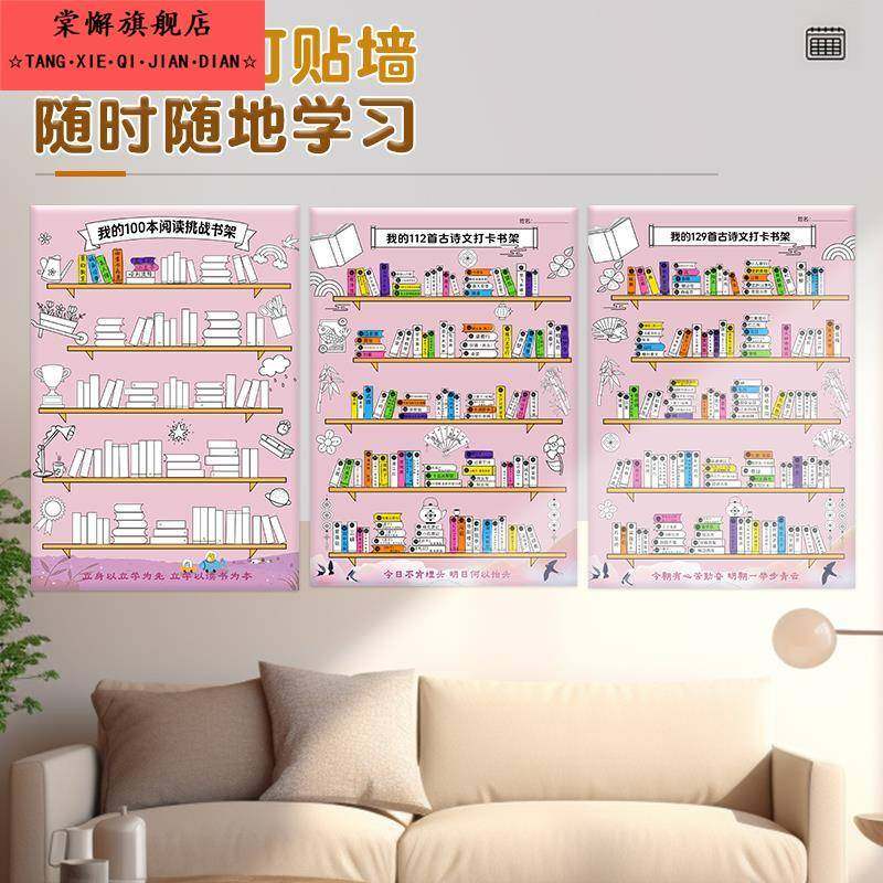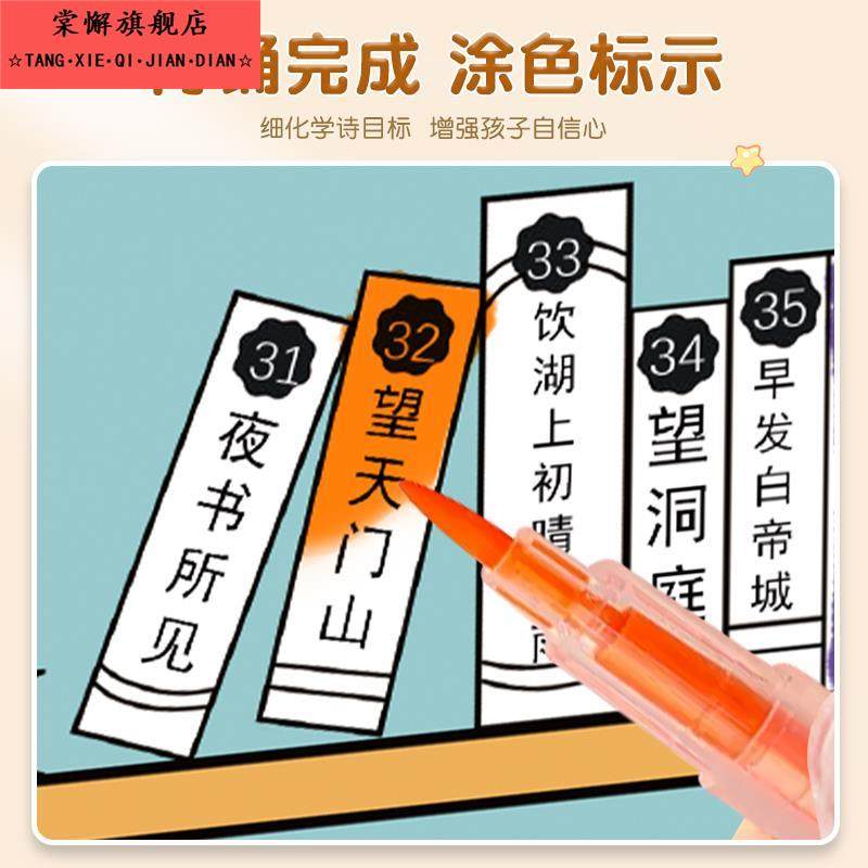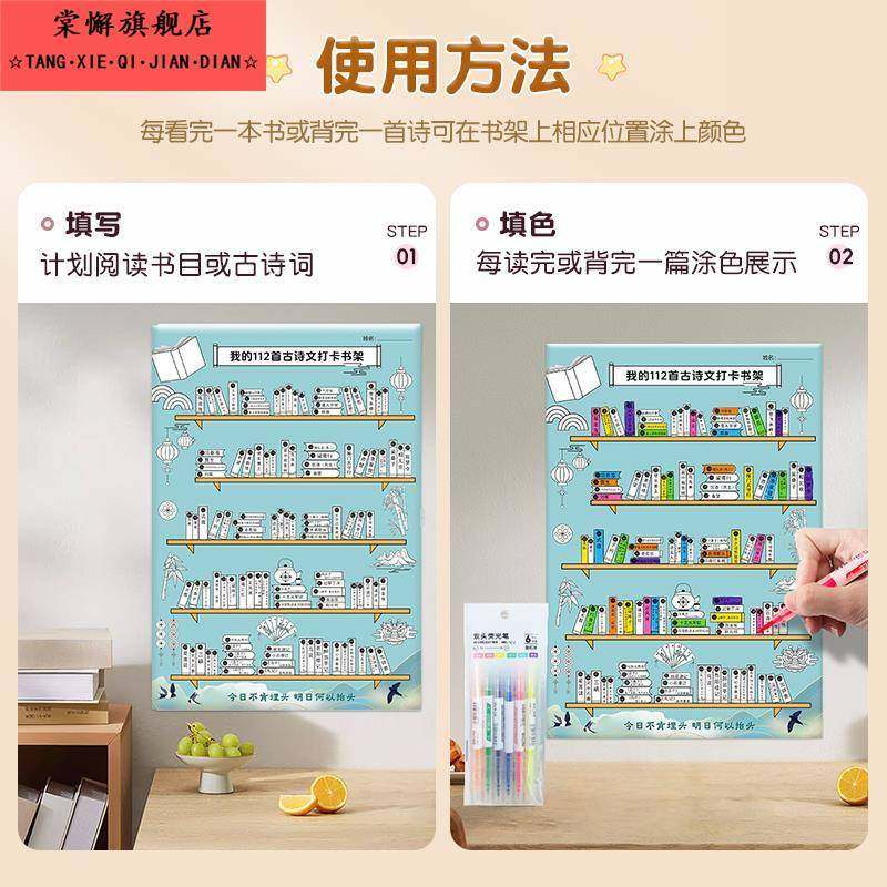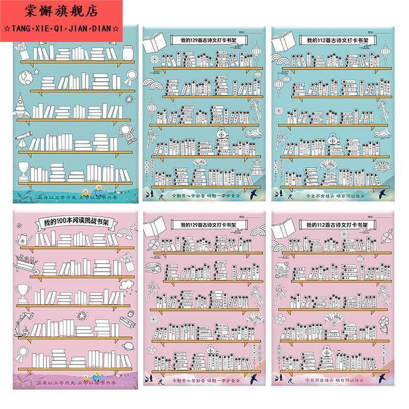 小学129首古诗文打卡书架古诗打卡记录表儿童自律阅读涂色海报挂图贴墙上初中必背112首古诗词读书计画 划表