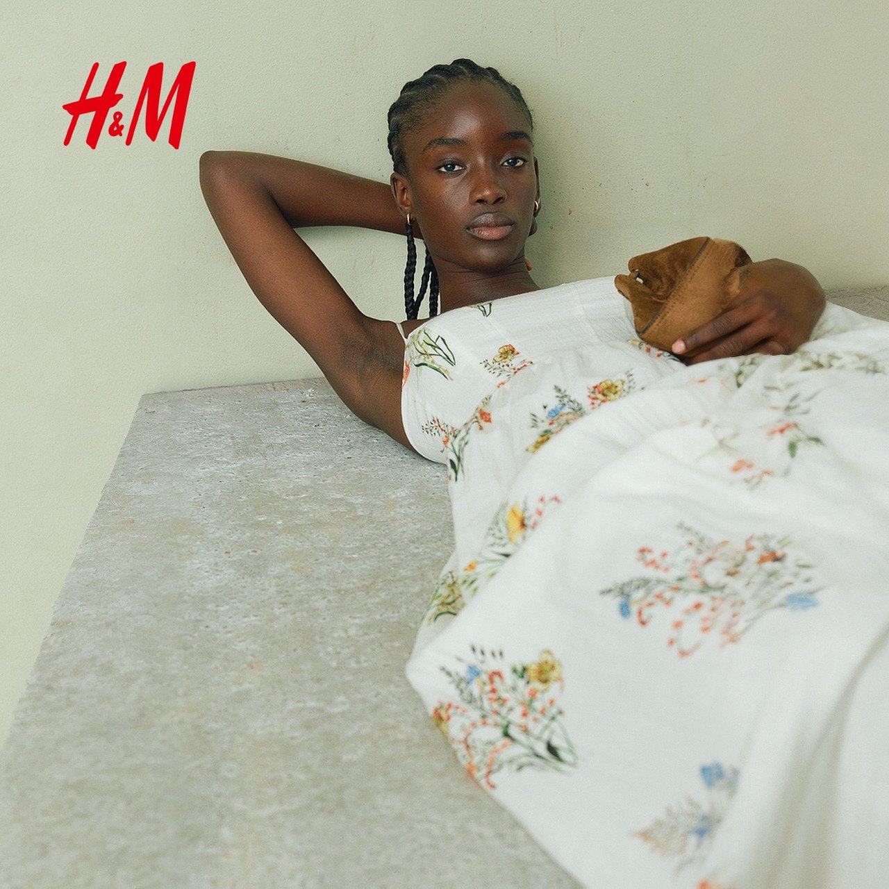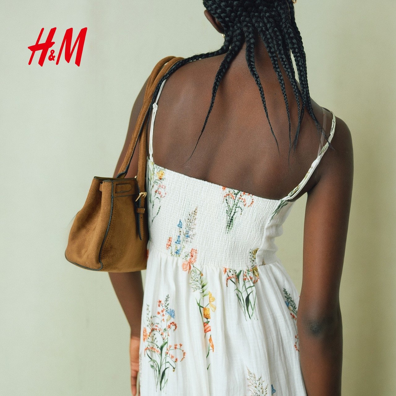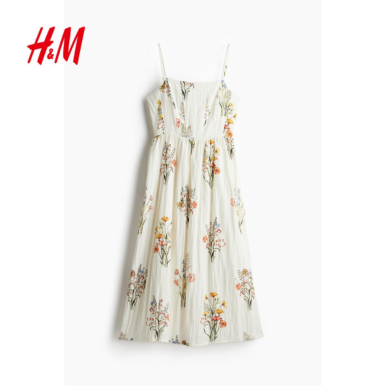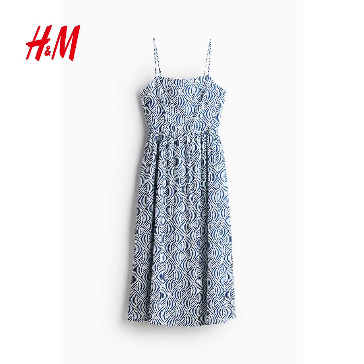 HM女装花卉连衣裙冬季度假风亚麻混纺印花吊带方领修身裙1217048