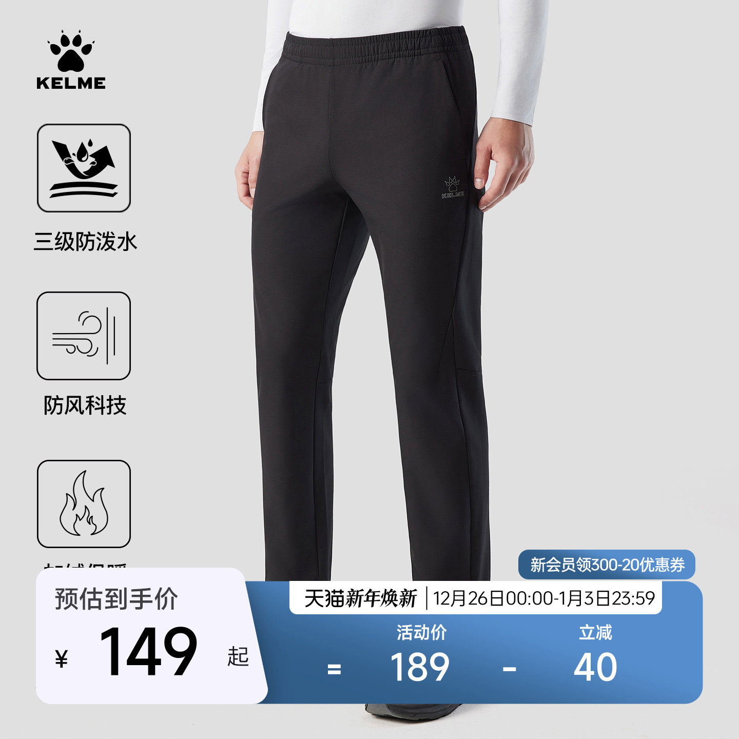 KELME卡尔美梭织运动裤男2025冬季新款防泼水长裤训练户外软壳裤