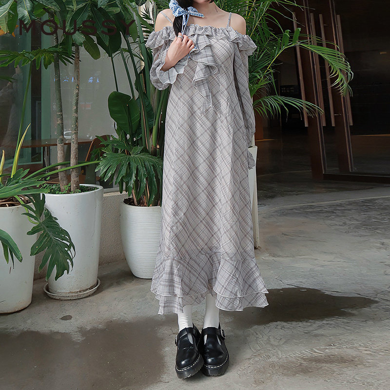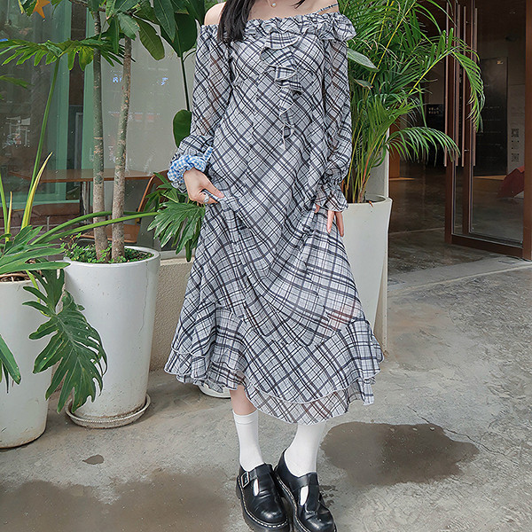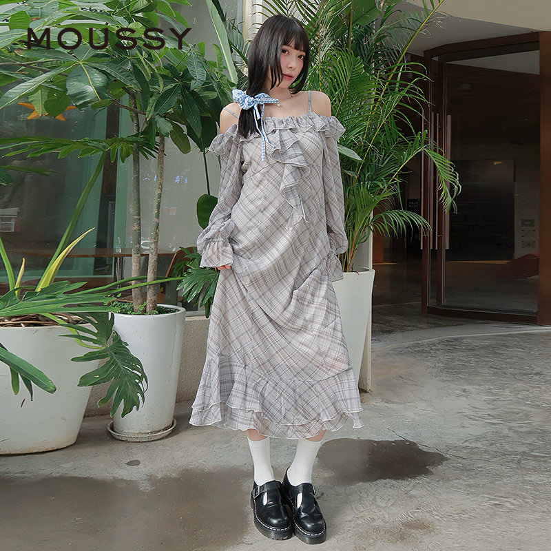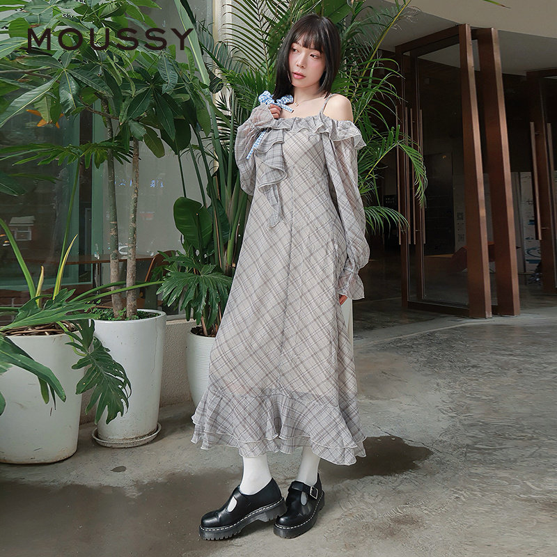 moussy 2025早秋新品甜美清新荷叶边长袖格子连衣裙028IAA33-1001