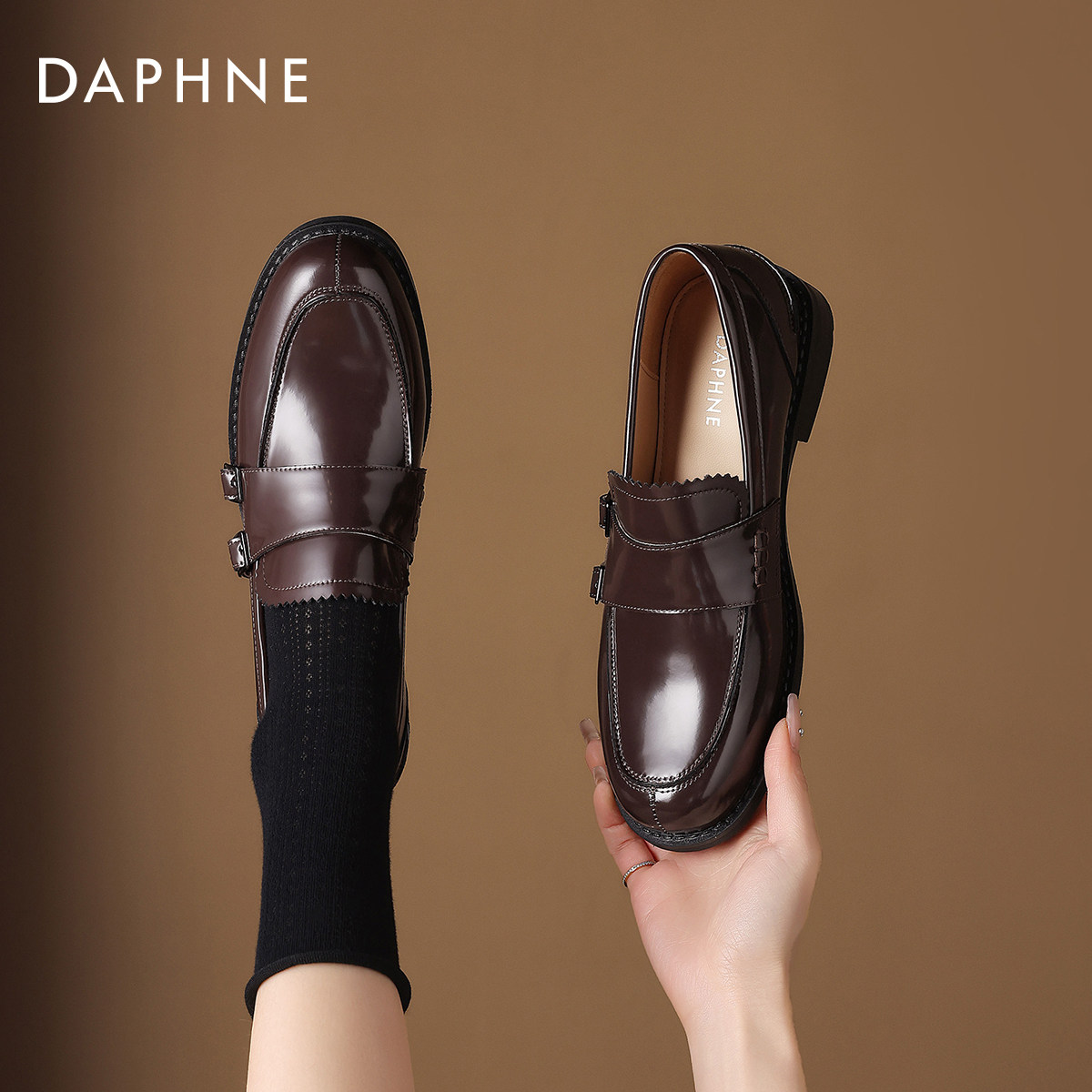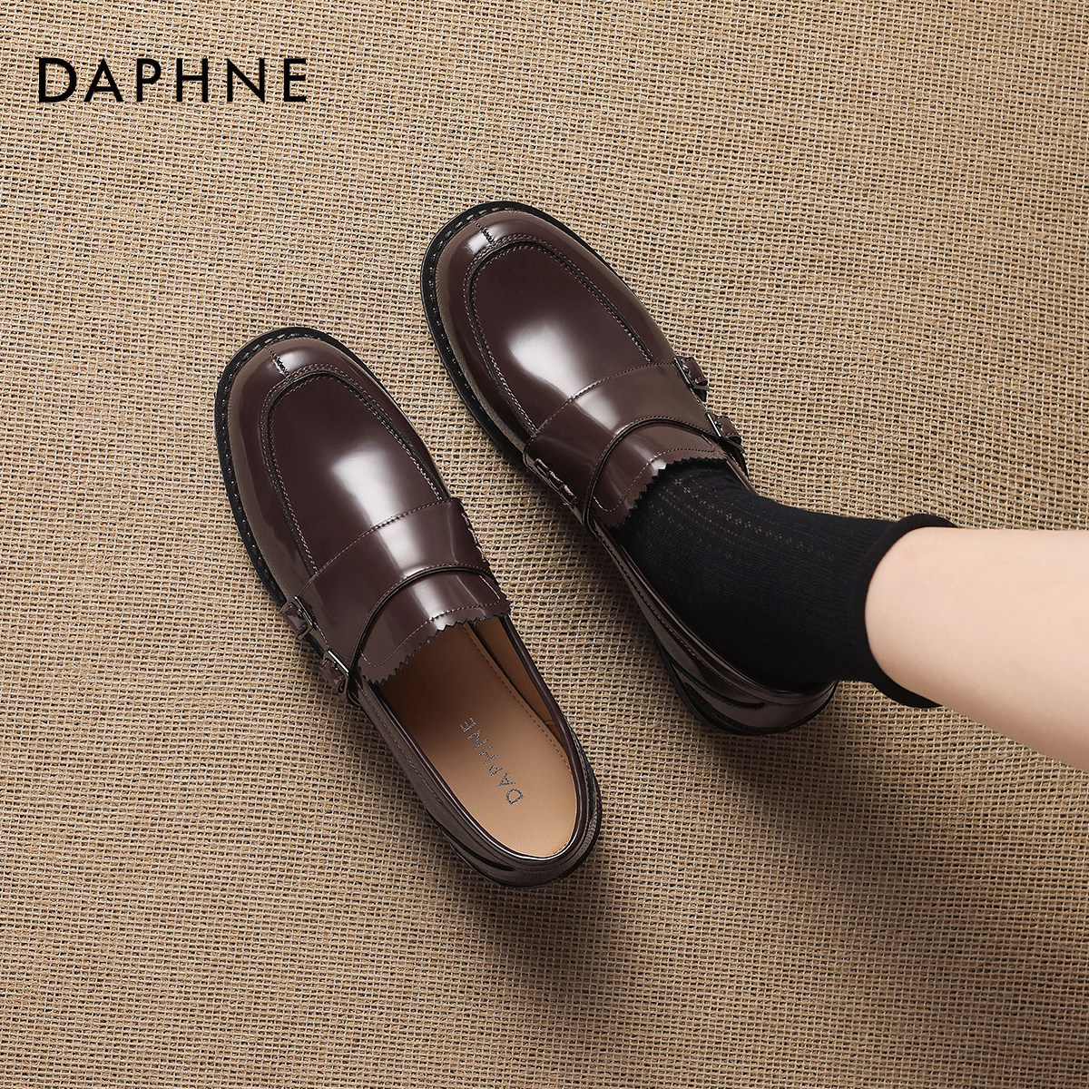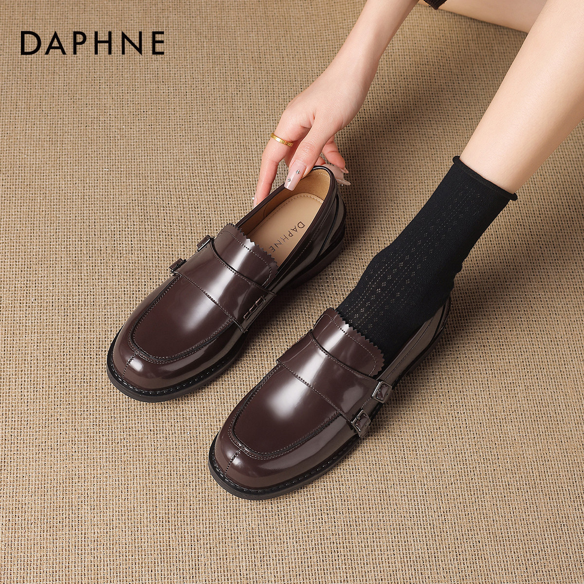 达芙妮乐福鞋女2026新款春复古漆皮一脚蹬英伦皮鞋布洛克平底单鞋