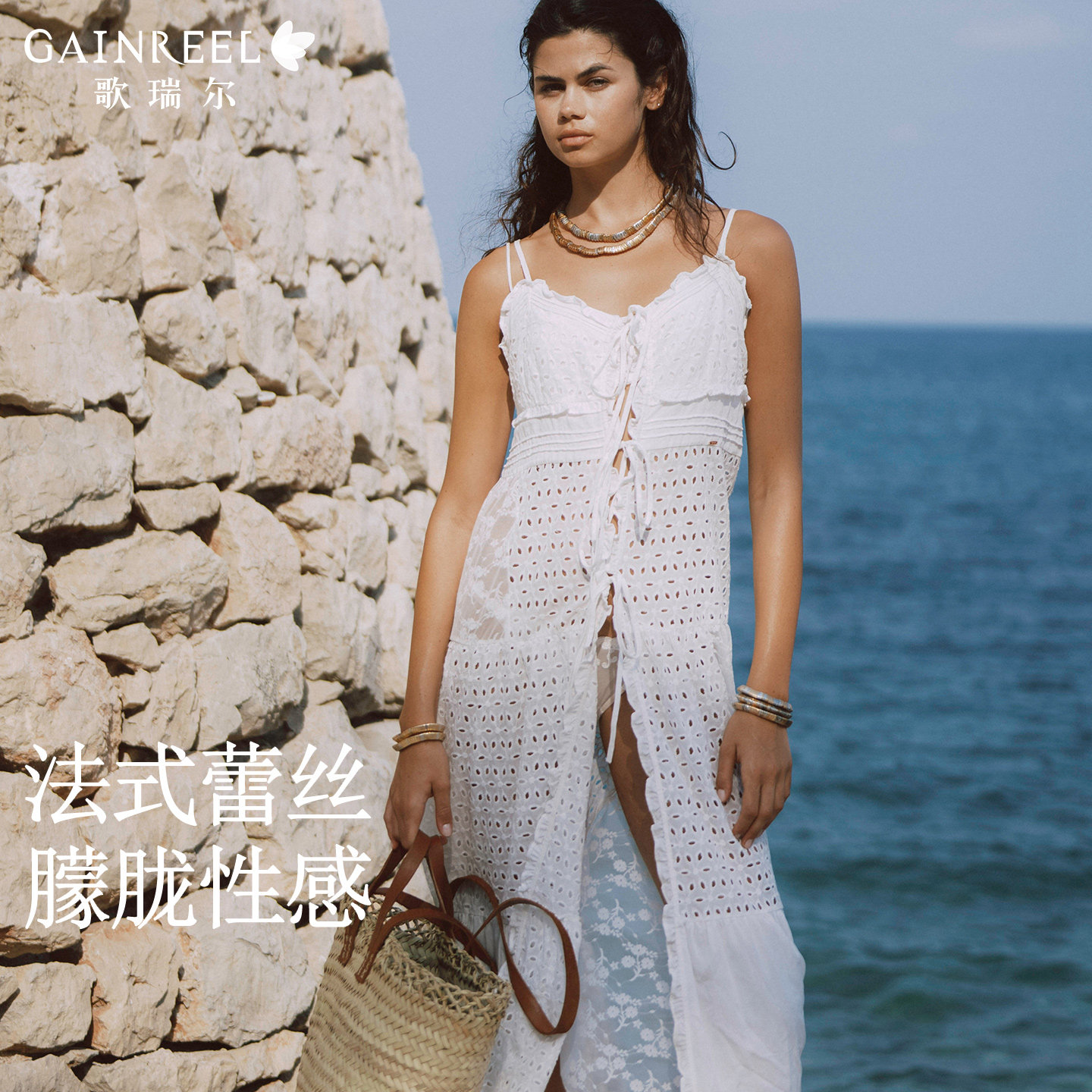 歌瑞尔性感纯欲睡衣女新款法式蕾丝透气睡裙吊带镂空绑带家居服